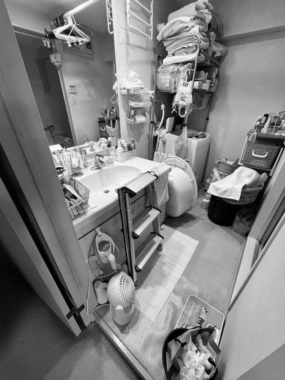 洗面化粧台はスペースが狭い、収納が少なく周りに物を置いてしまい空間的にも狭くなっていました。 今回は洗面化粧台のカウンターを広くし、座ってお化粧もできるようにしました。 カウンター下は椅子や洗濯カゴをしまうのにちょうどいいです。 洗面化粧台は収納力もアップしたので周りの荷物もしまうことができます。 スッキリと広々な空間になり、朝の身支度も楽しくなりますね!