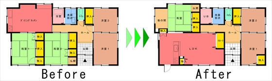 2つの和室と押入をつなげて、広いリビングダイニングに。新築同様の仕上がりになりました。