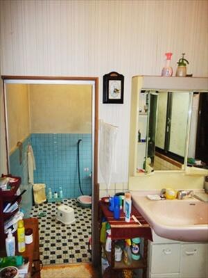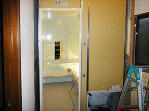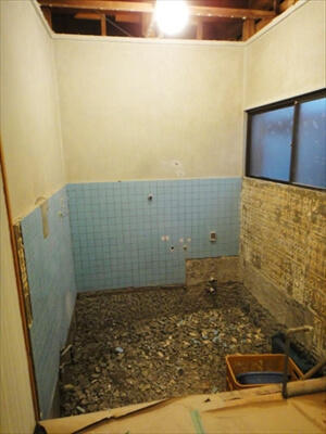 システムバスを据え付ける場合、間仕切り壁も解体することが多いです。その上で浴室内部の解体をして土間コンクリートを打設し、そこにシステムバスを据え付けます。右上の写真は、土間コンクリート打設前の状態です。