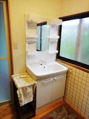 仕上がった間仕切り壁に新しい洗面化粧台を据え付けて完了です。