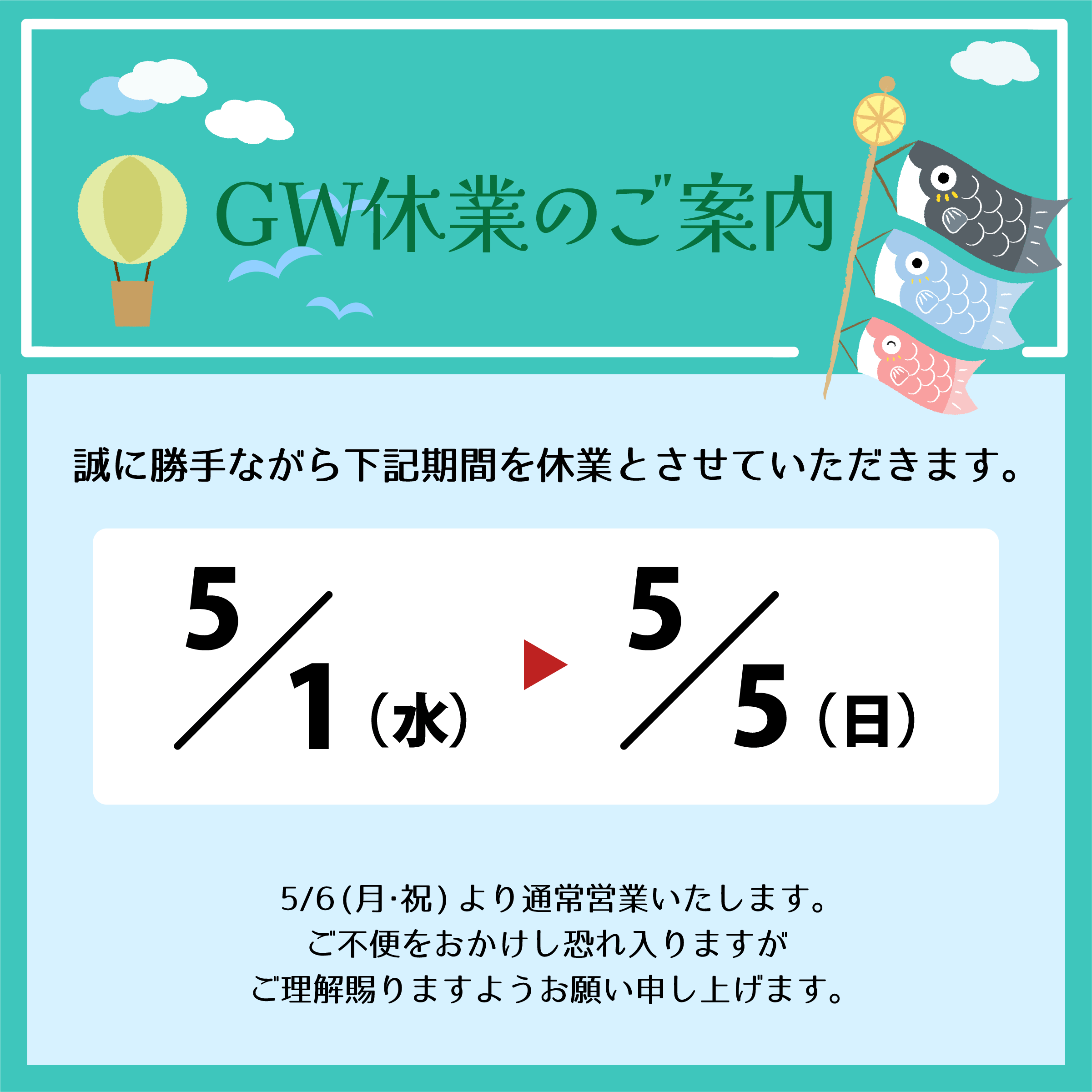 5月6日(月祝)より通常営業いたしますので、よろしくお願い申し上げます。