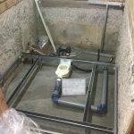配管、ユニットバスを固定する為、コンクリートを打ちます。写真は組み立て途中。スパージュはリフォーム工事にも対応。フレームが分割できて施工性が良いです。