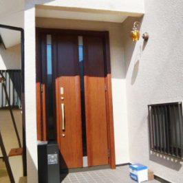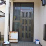 既存ドアのドアノブが故障したため、LIXILオススメのリフォーム用玄関ドア『リシェント』に交換いたします。夏は西日が暑く、冬は寒い玄関はお悩みの種でした。外壁塗装と同時に施工。外観が一気に変わりました。