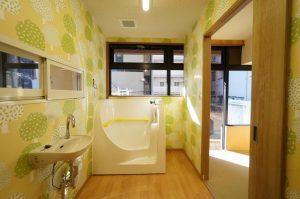 手洗い器(LIXIL L-15)サーモスタット付自動水栓(LIXIL AM-210TCV1)も完備。ハンドルに触れず、衛生的にご利用できます。奥に見える白い四角いスペースは幼児用シャワーパンです。(LIXIL PF-1175Y(3)-K1/FW1-Y+NP-K1A-5を設置致しました。)三方の高い壁が周囲への水はねを抑えます。また、お子様がしっかり握れるL型の手すりも付いているので安心です。水回りスペースはポップな木があしらわれた壁紙がかわいいですね。