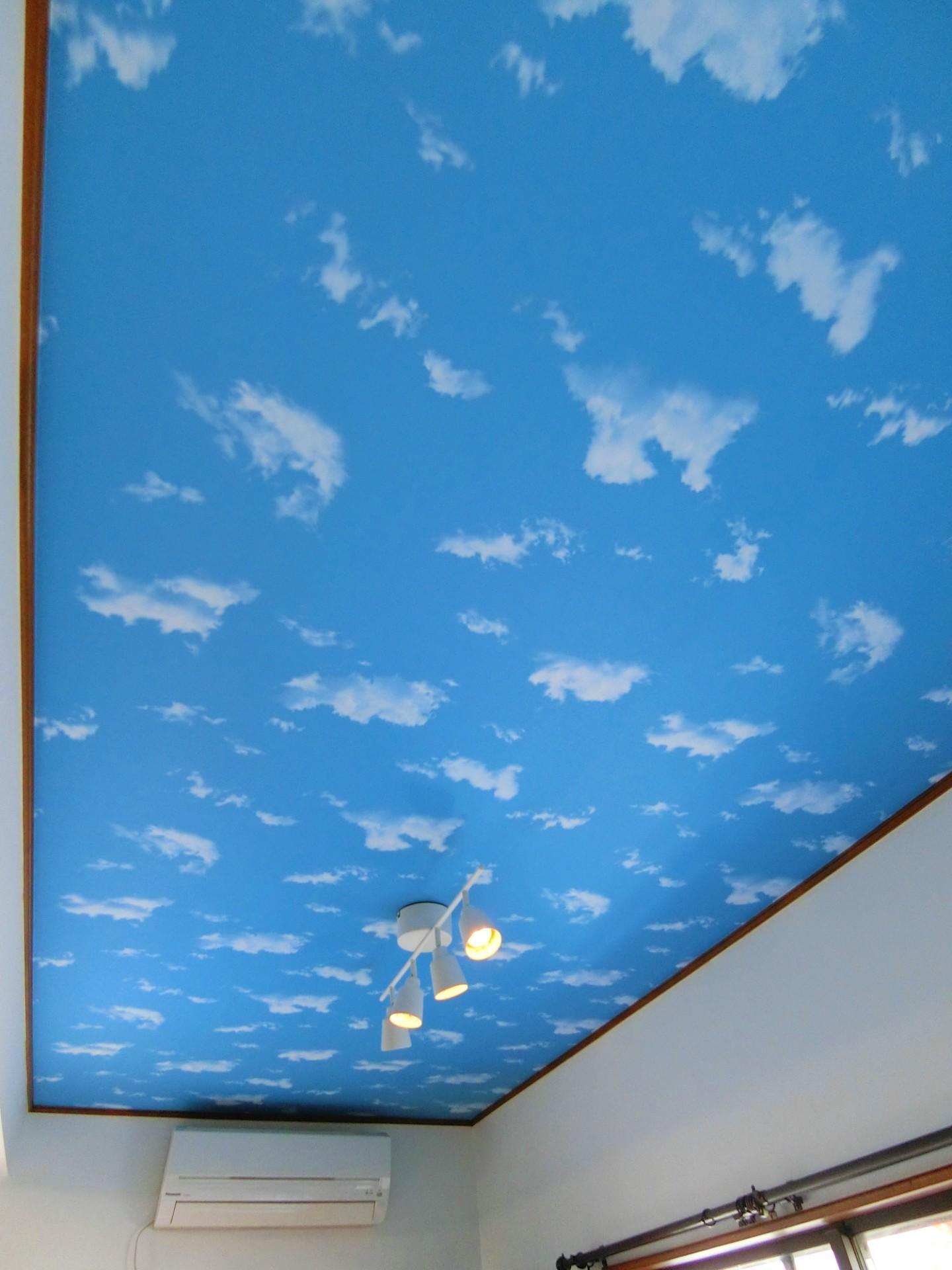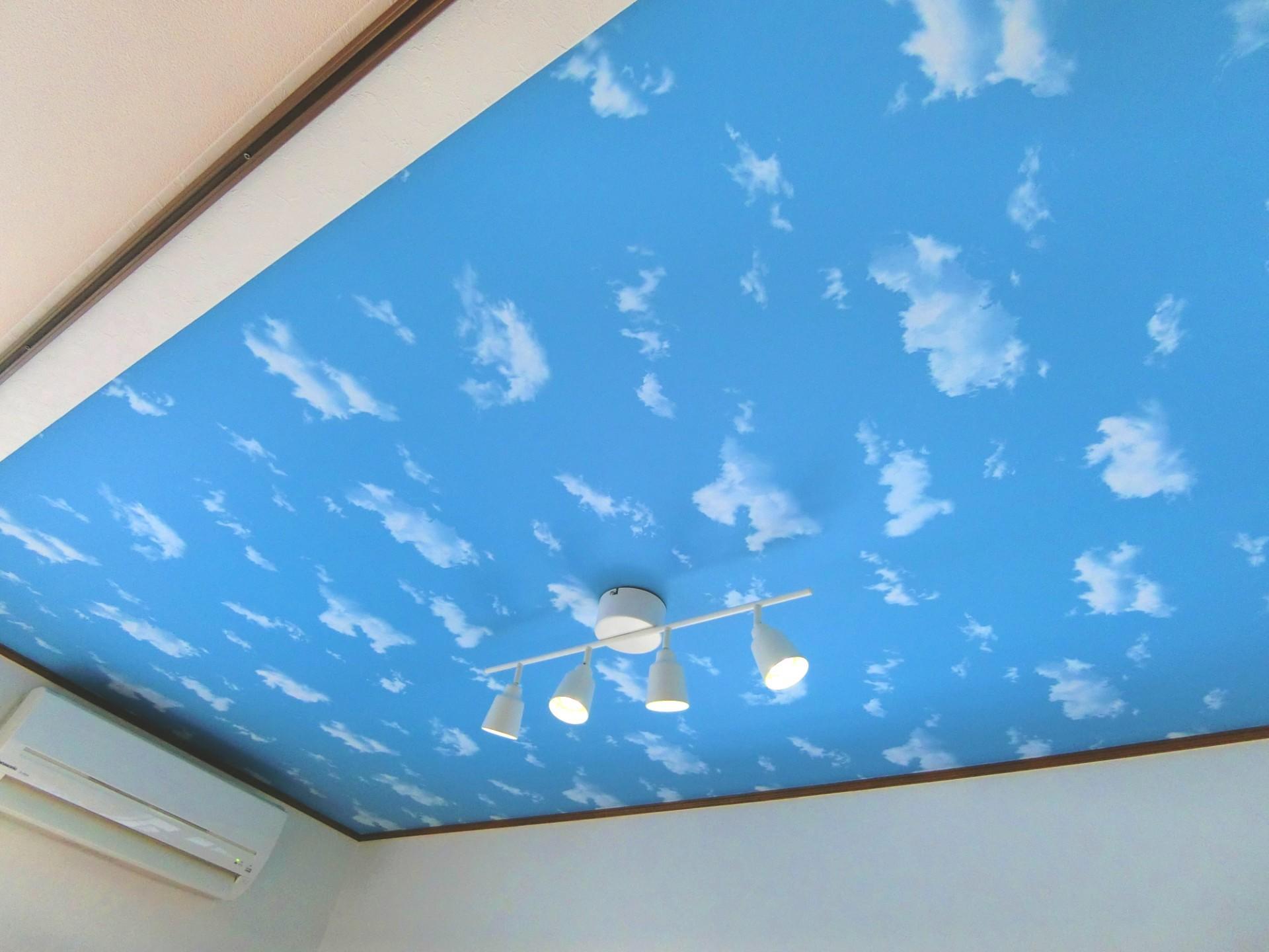 お部屋の一角の天井を、一般的な白いクロスから青空柄のクロスへと張り替えていきます。奥様が通院されている歯医者さんの壁紙が一面青空柄だったことから、ご自宅にも青空柄を取り入れたいと思ったそうです。ただこれまではオーソドックスに白色だったため、どんな風に仕上がるかドキドキされておりました。