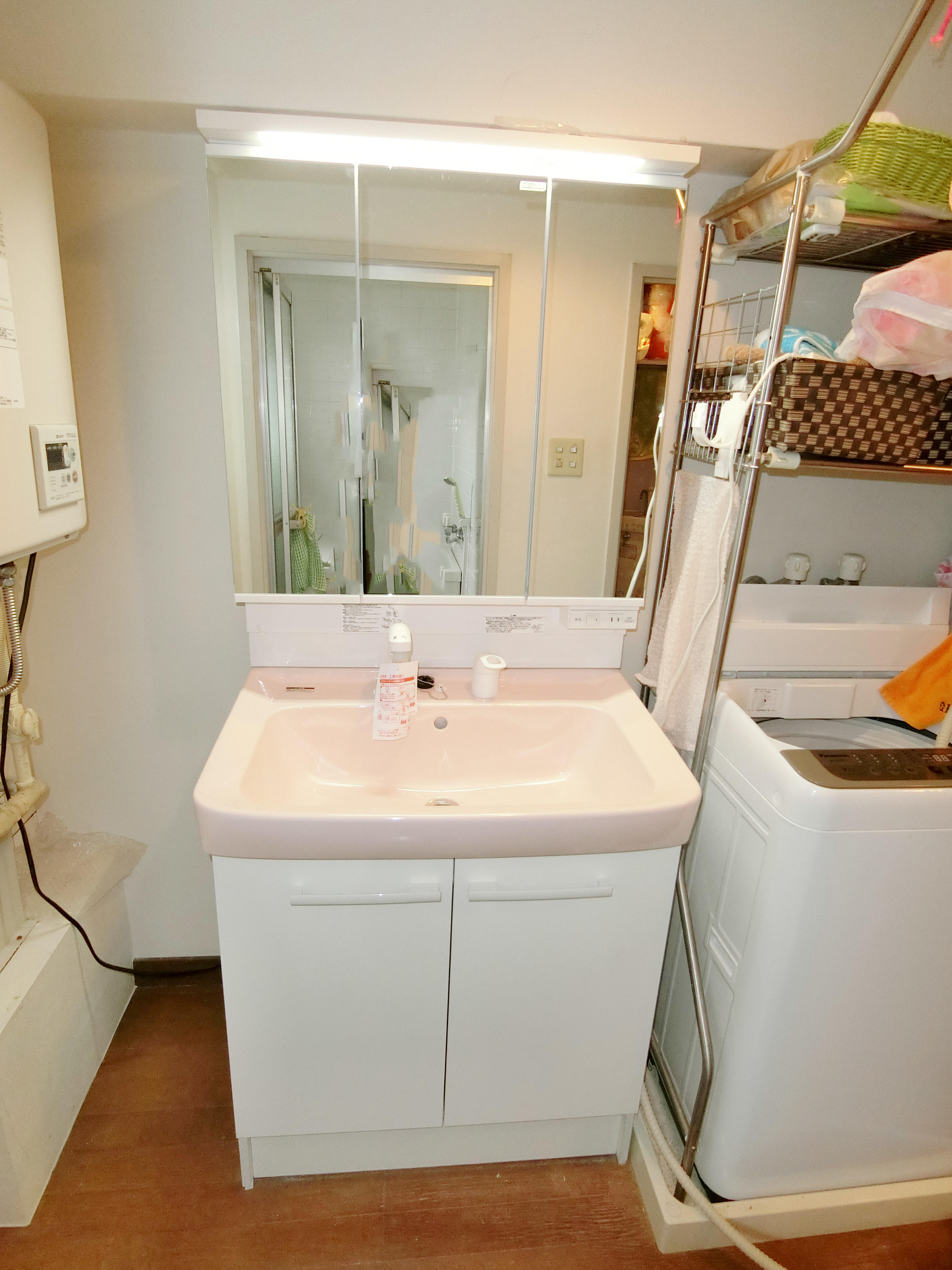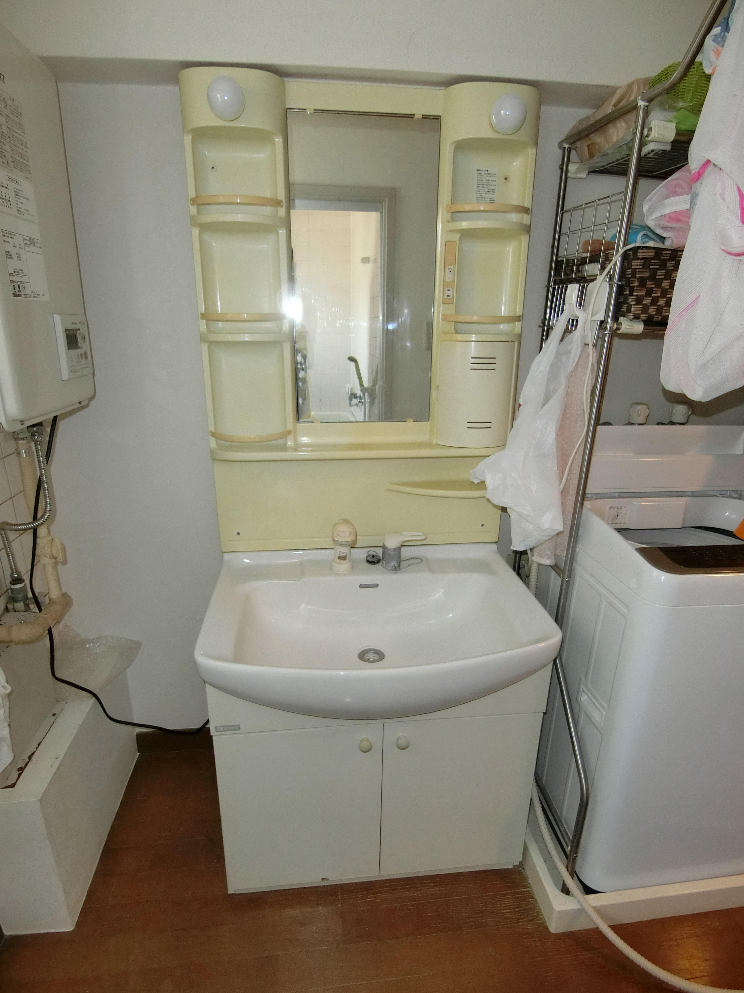 40年程大切に使われてきた洗面化粧台。パッキンの金具の劣化により漏水してしまい、交換することとなりました。