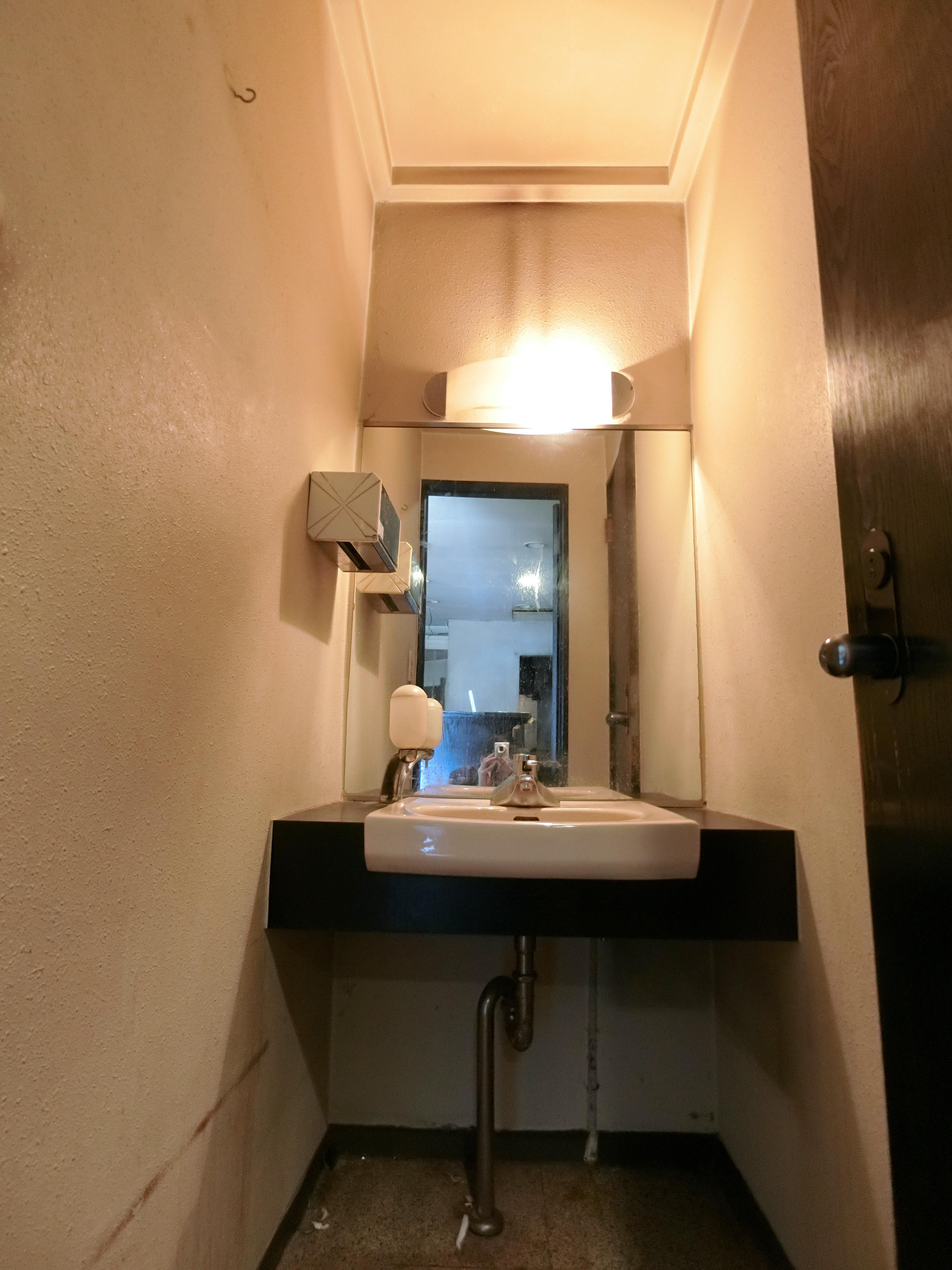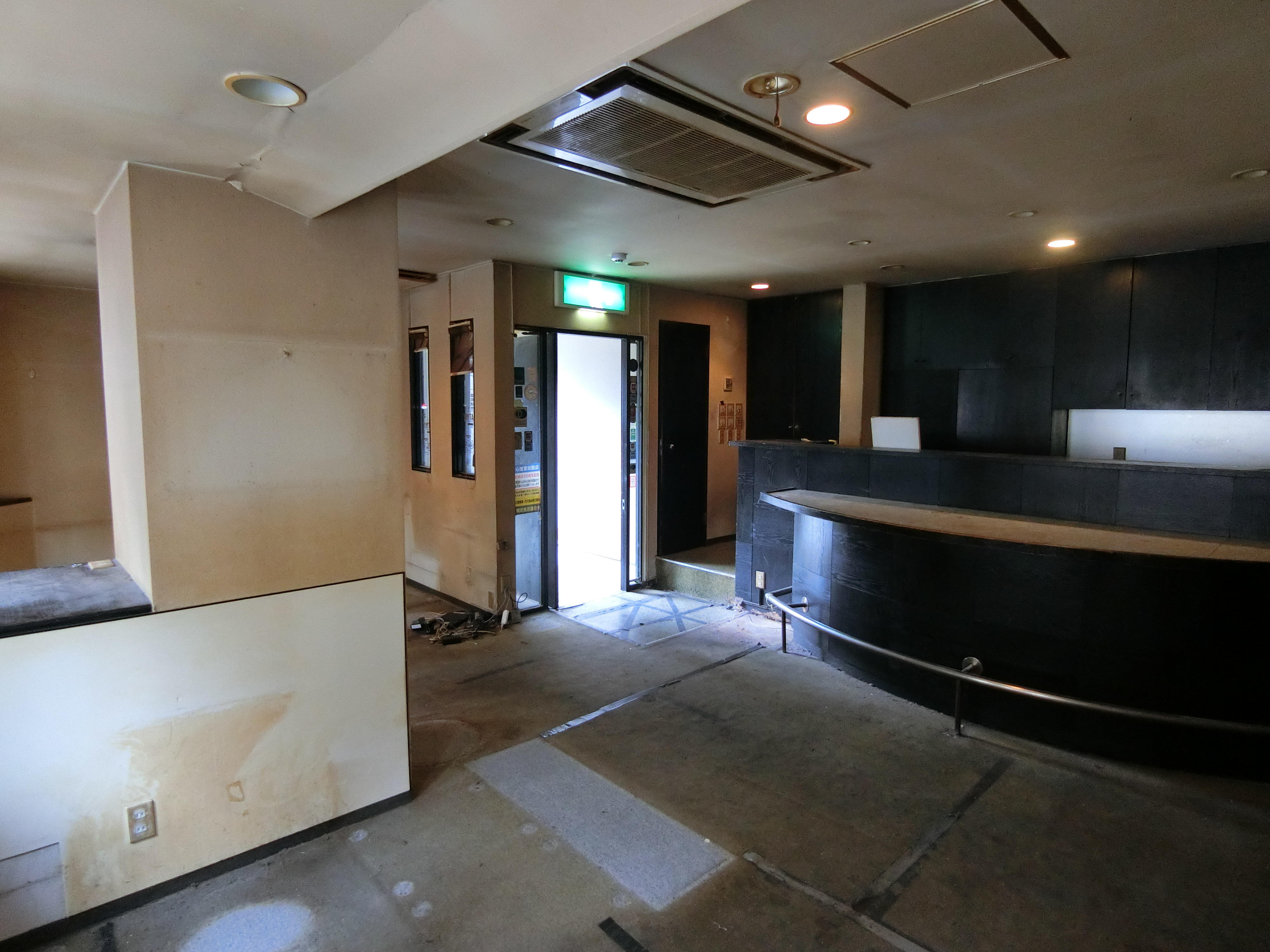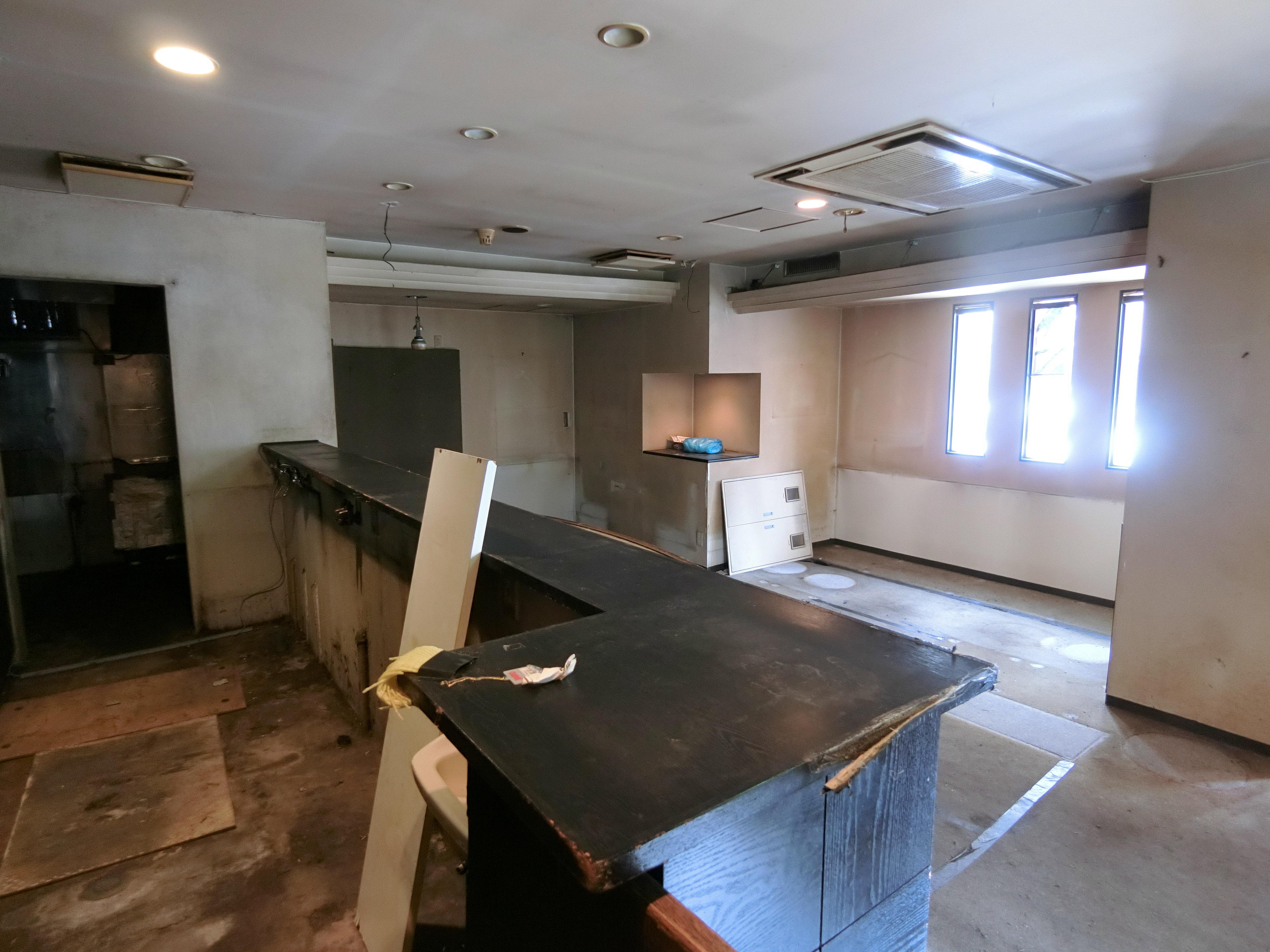 向かって左奥にキッチンスペースがありました。クリニック事務所には不要なスペースなのでこの壁も取り除いてきます。