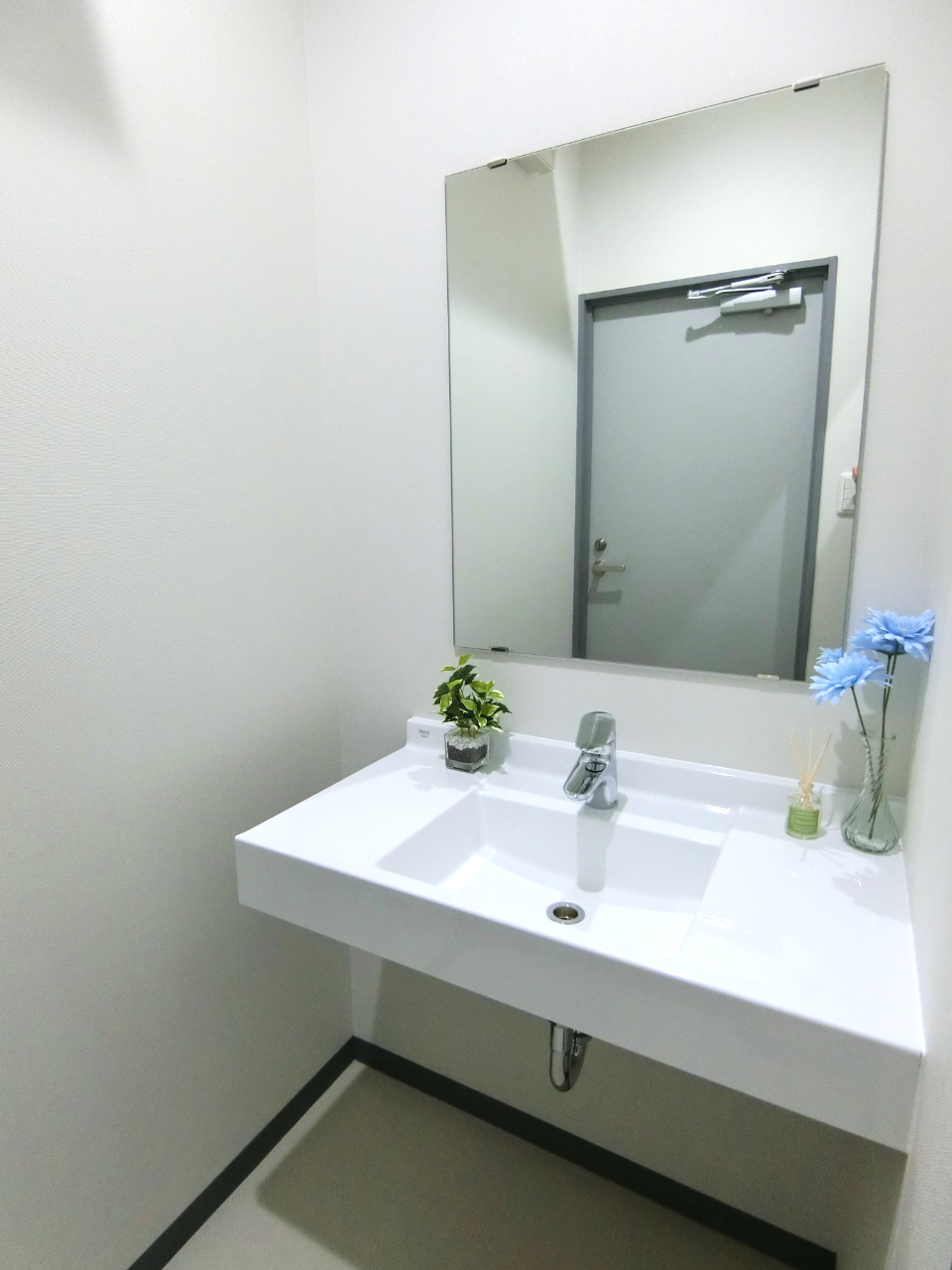 もとからある隣のクリニックと行き来するための引き戸を設置いたしました。鮮やかな青色の扉の先には、洗面化粧室とトイレがあります。引き戸と洗面化粧室の扉に、お客様こだわりの青色が差し色で入ることでメリハリのある空間となりました。