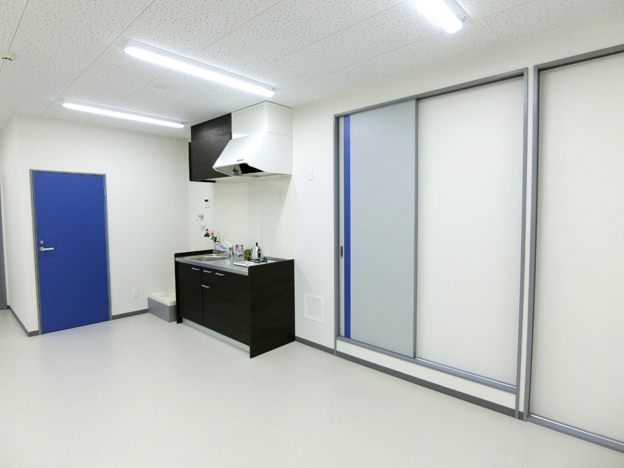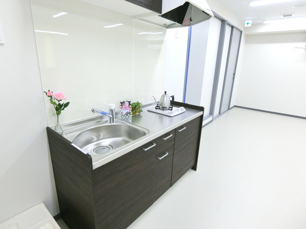 左奥にあったキッチンスペースを取り除いたことで奥まで広々とした空間が生まれました。飲食店程の大きなキッチンスペースは不要ですが、お湯を沸かしたりスタッフの方々がちょっと流しを使えるようコンパクトなキッチンを設置いたしました。(LIXILキッチン Tio)