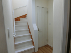 枠は以前のままで階段の蹴込、踏面を白くして手摺が付いていないかったので安全のために設置させて頂きました。全体的に白でまとめていて外からの光で少しでも室内が明るくなるようにしています。