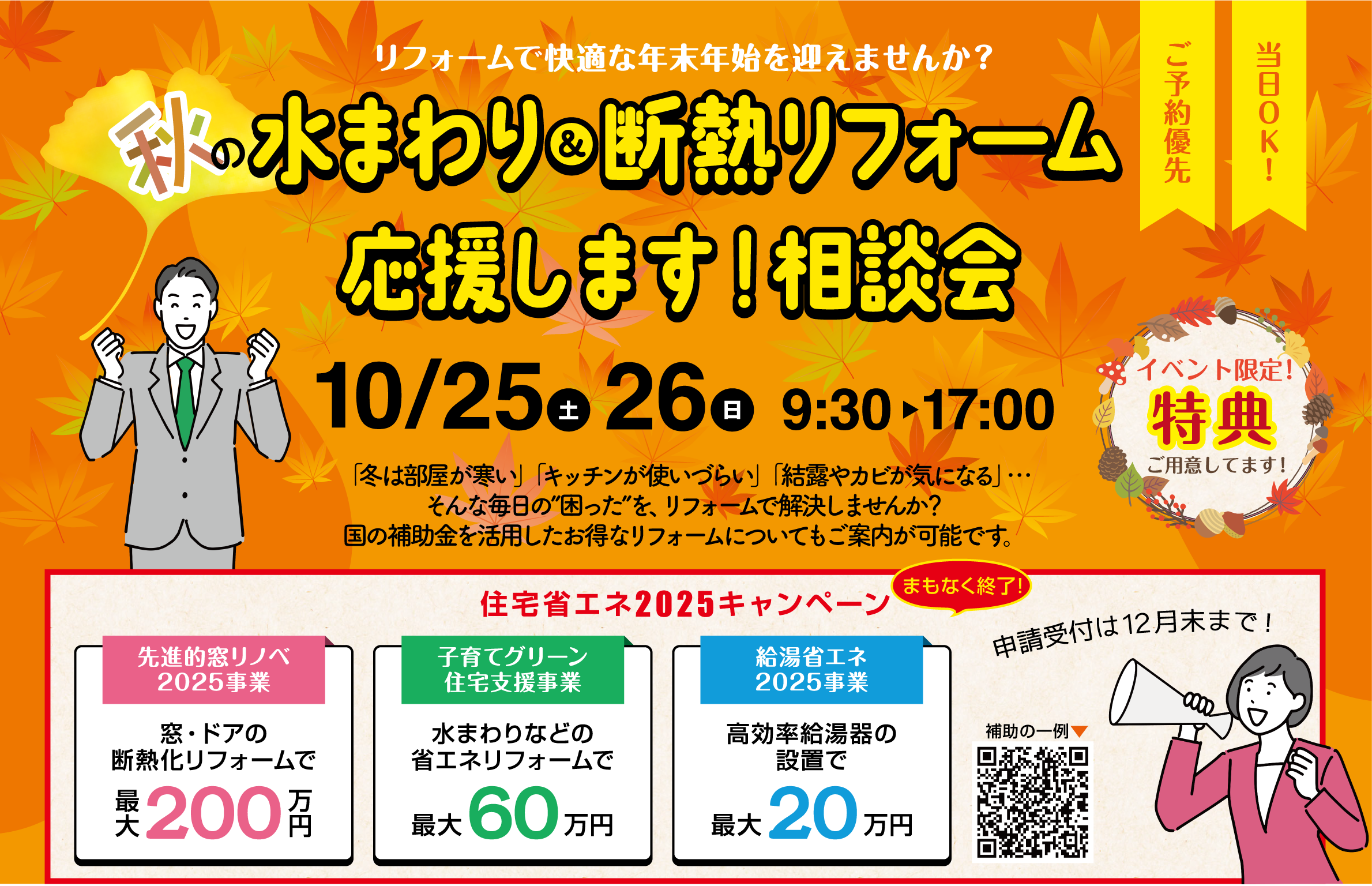 10/25(土)・26(日)に、秋の水まわり&断熱リフォーム応援します!相談会を開催します!