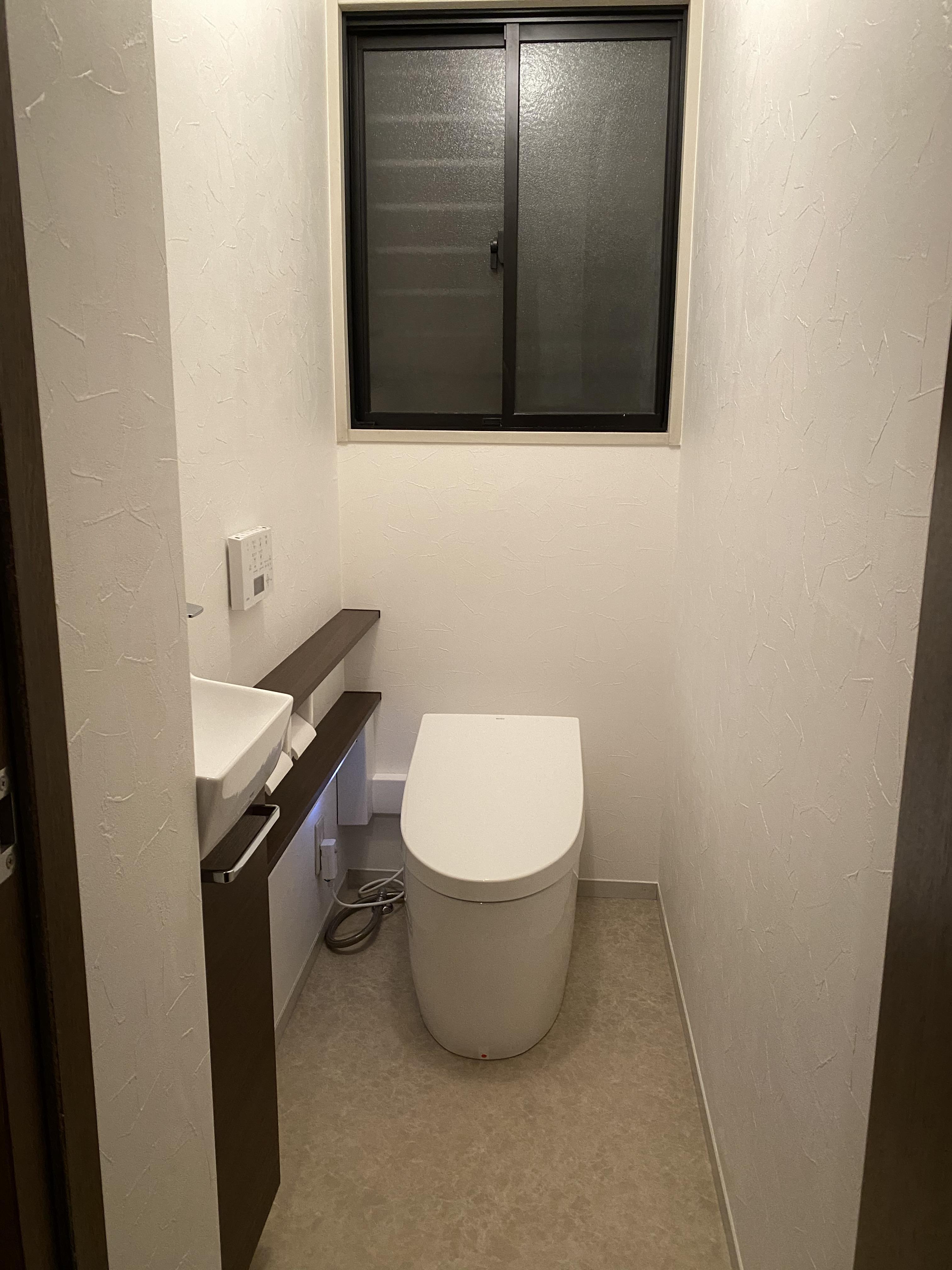 二世帯住宅の親御さん世帯のトイレのリフォームです。 手洗い付きのトイレをタンクレスにするとともに手洗い器を別につけました。 ワンデーリモデルなので、給水分岐・排水は合流となり、既存の給排水管をそのまま利用。 大がかりな工事なく、一日で工事完了です。