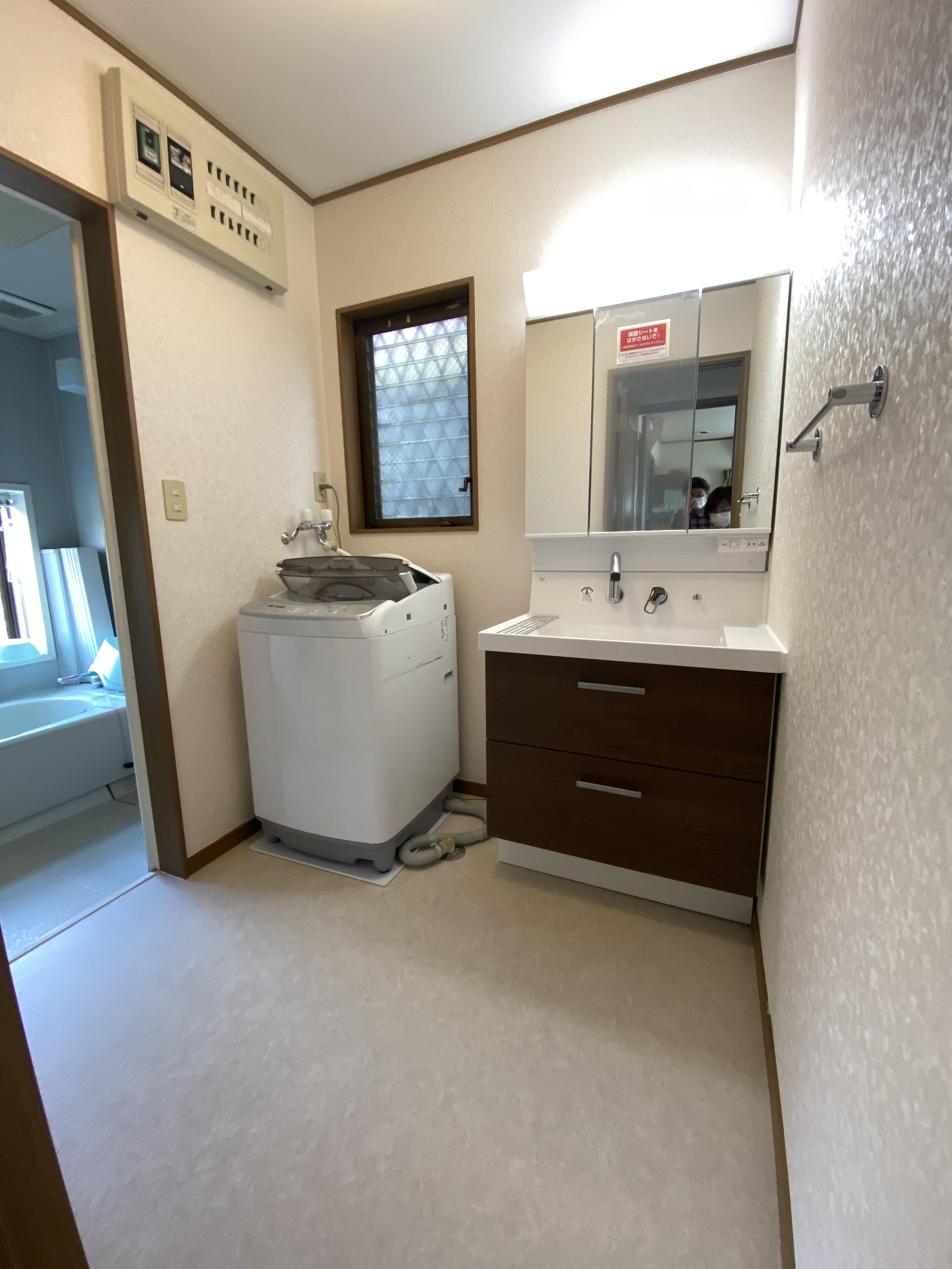 お店から歩いていける一戸建てのお宅の洗面化粧台の取替工事です。 LIXILのL.C.は、バックガードとボウルが一体成形になったカウンターです。 つなぎ目がなく、はねた水滴をサッと拭き取れます。 ちょっとした手洗いにも便利です。フルスライドタイプで、奥のものも取り出しやすくなりました。