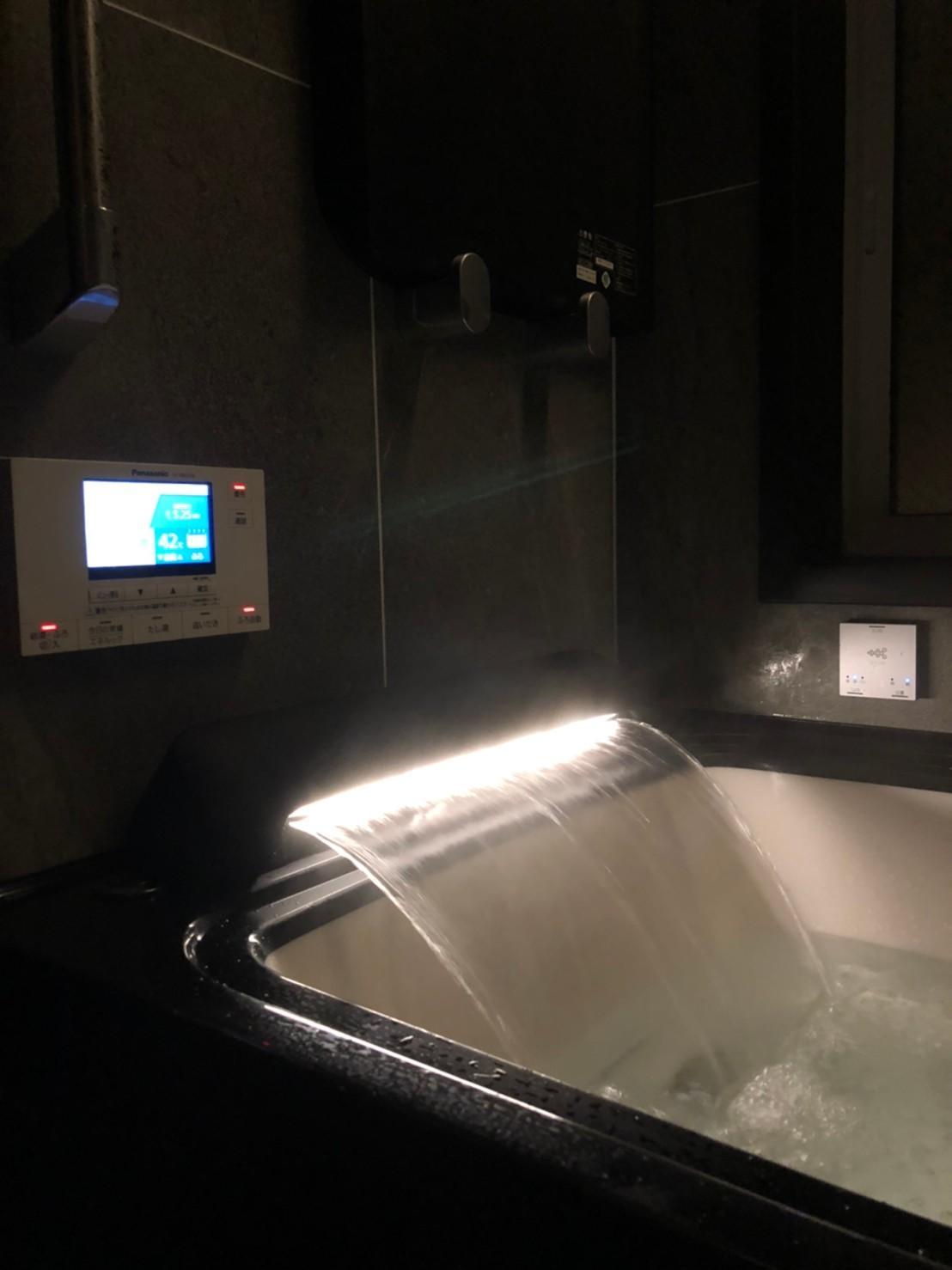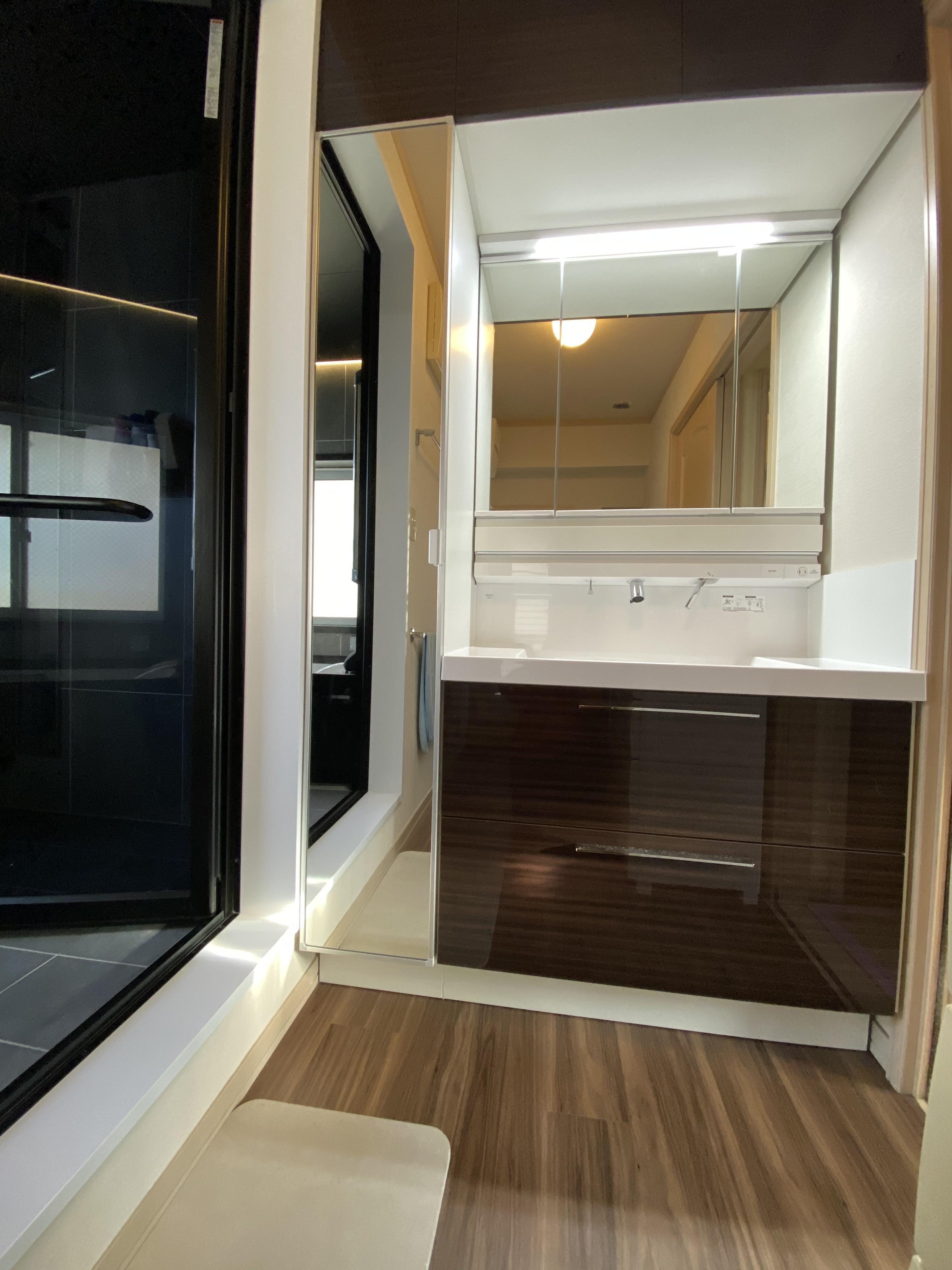 浴室・洗面台の水廻りの工事です。 ショールームでLIXILのスパージュに一目惚れされました。 オーバーヘッドシャワーとアクアフィール(肩湯) ブラックで高級感と統一感がある床壁タイルです。 洗面化粧台は、LIXILのL.C.です。