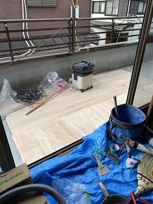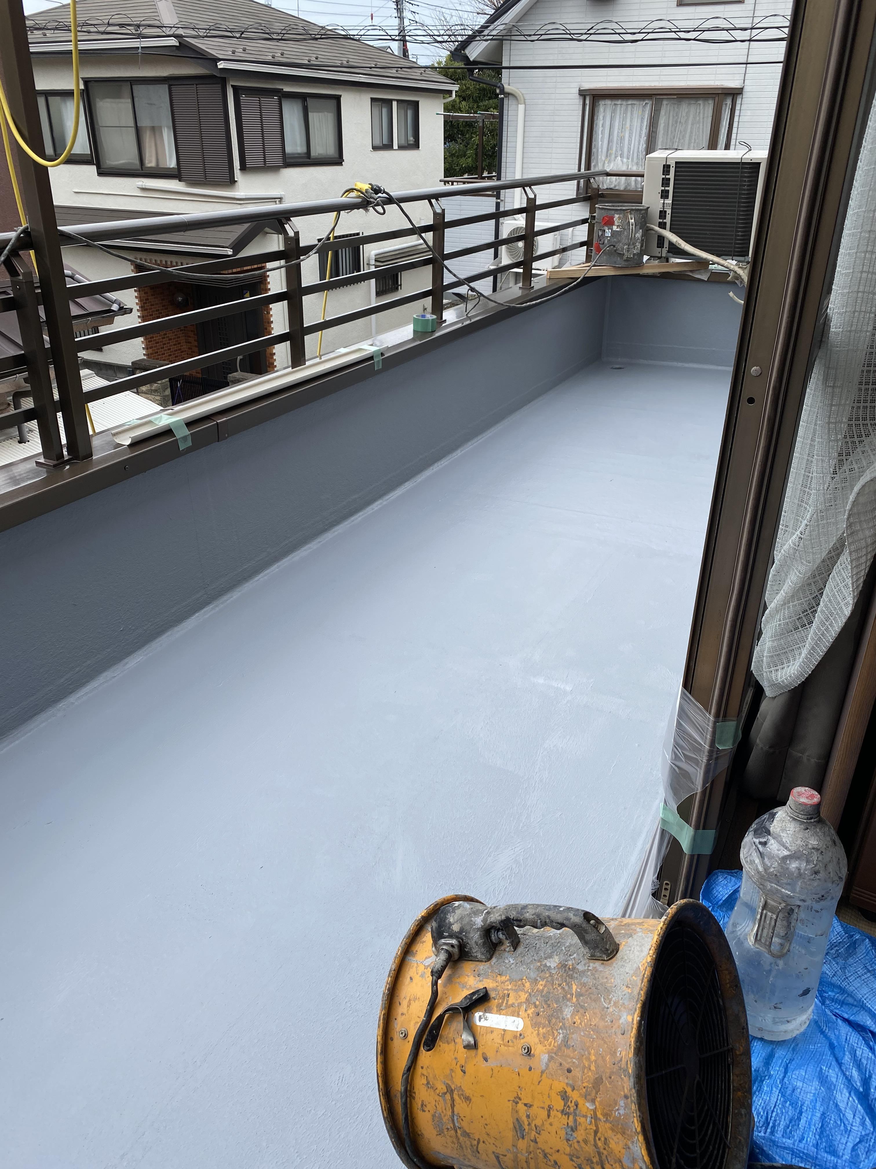 ベランダ防水をしました。 経年で剥がれはじめ、下地も心配でした。 ベランダの一部の下地を張り直し、そしてアクリル系の水性塗膜水材を用いて、ベランダの防水をします。