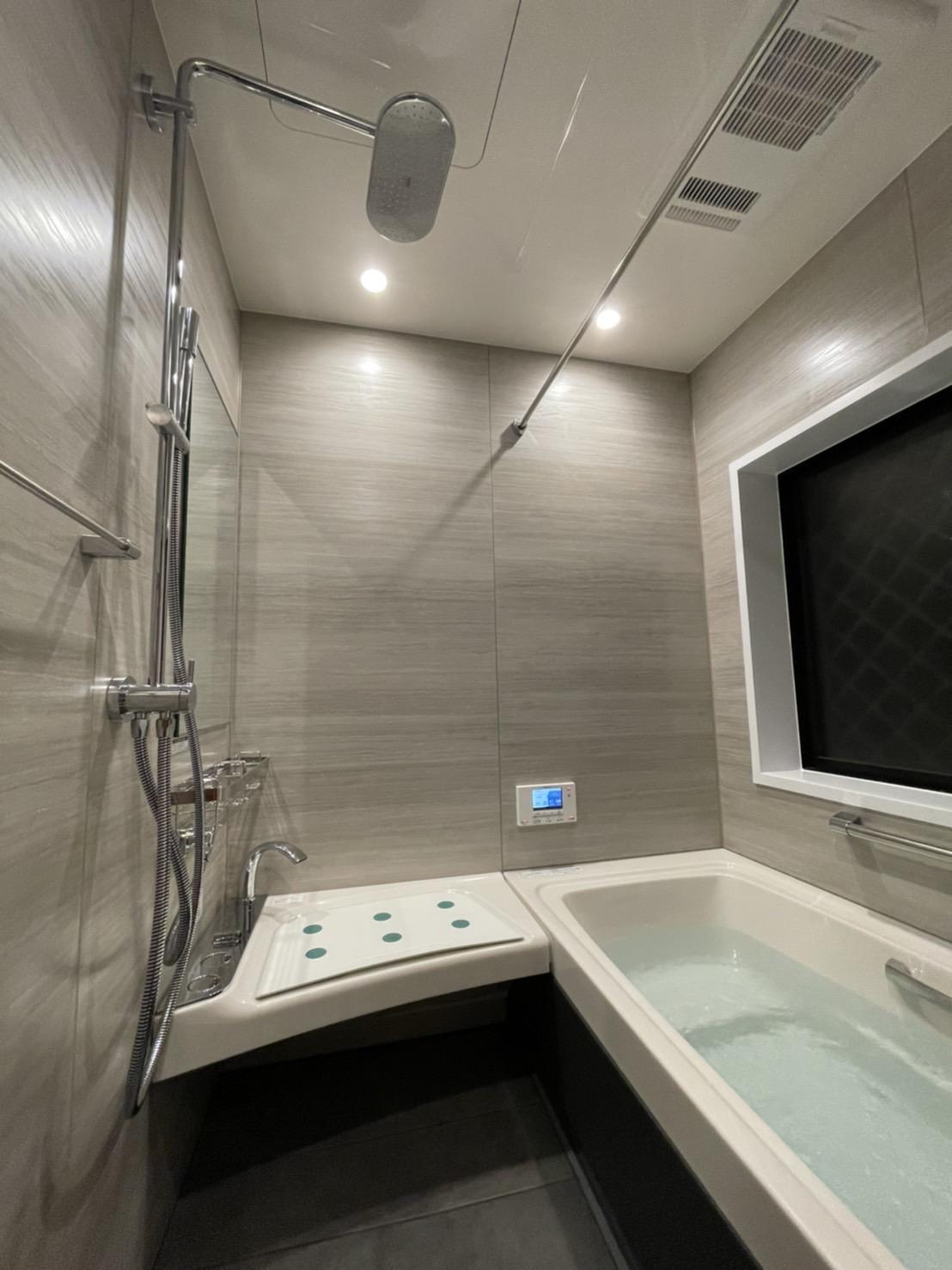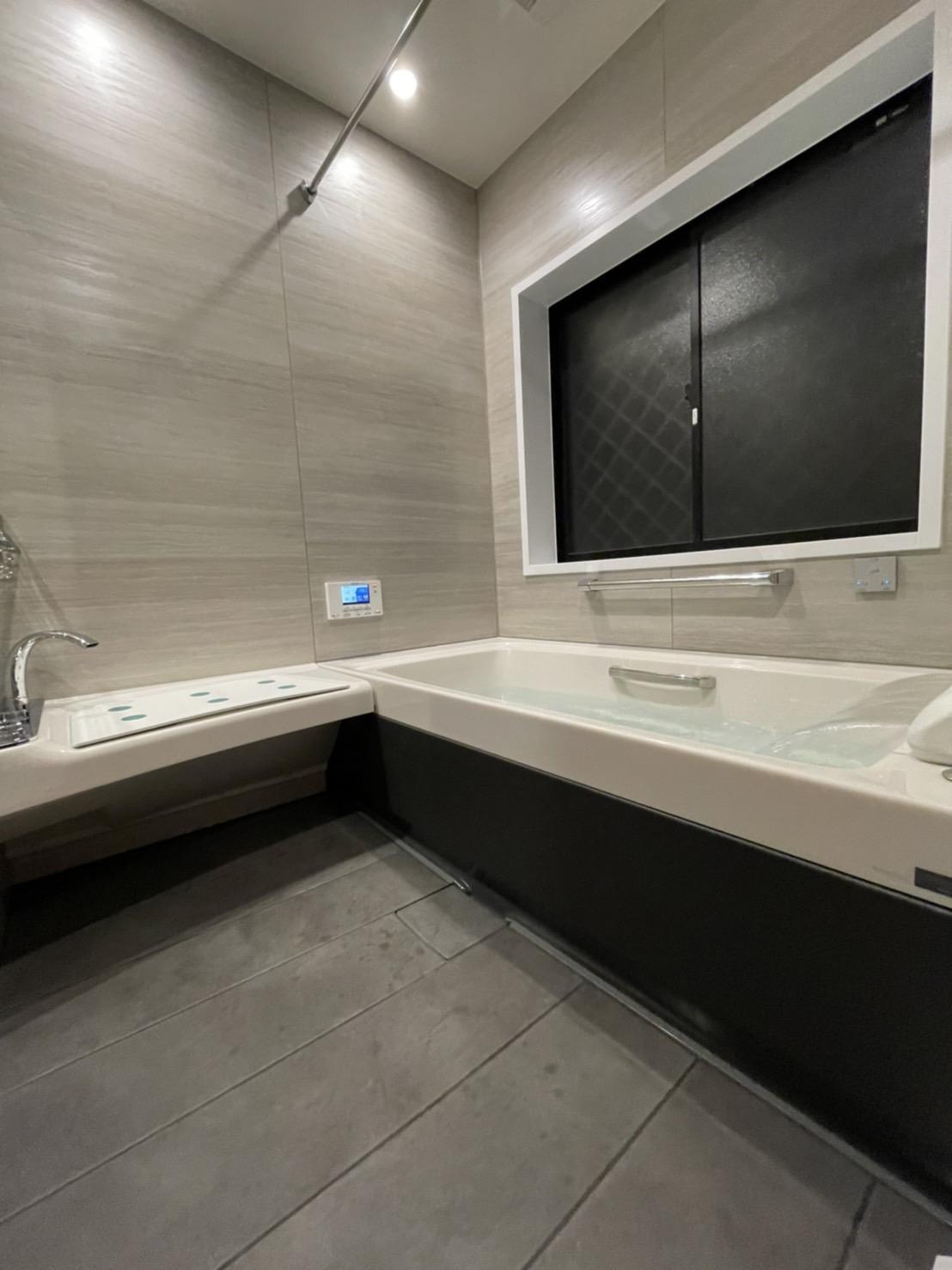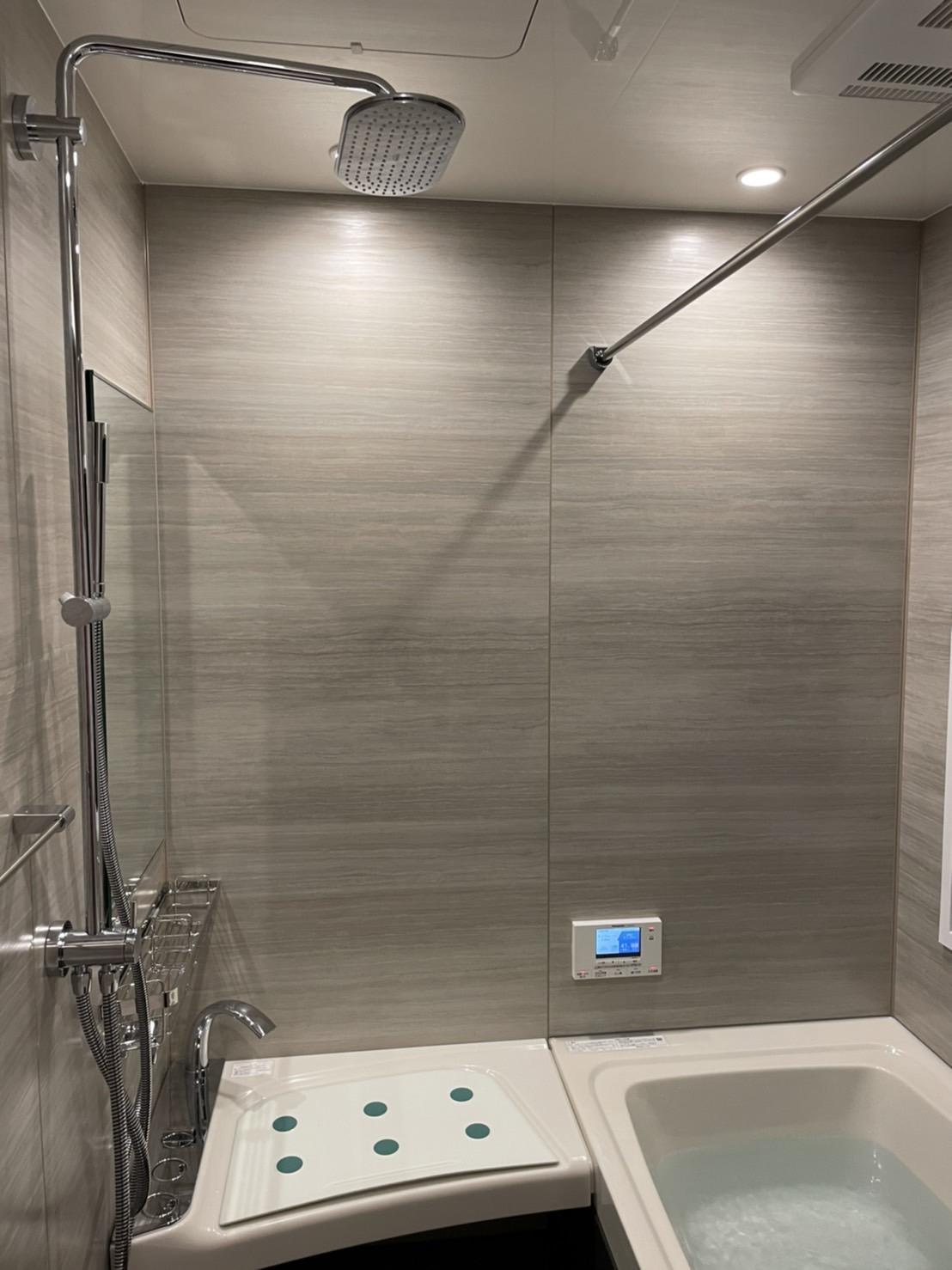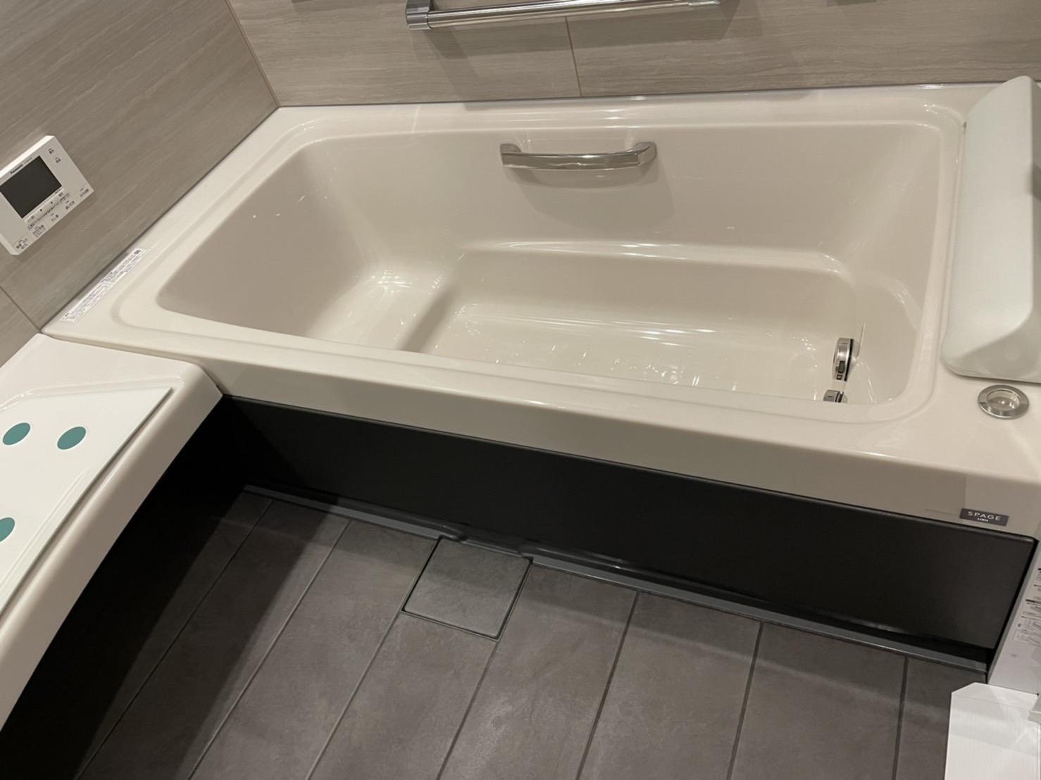 ルミシスのお色味と馴染むダークストーンの床に、セルペジャンテ壁パネルとLIXIL最高級の滑らかさを誇るグランザ浴槽。スパージュ品質が際立っており素敵です。