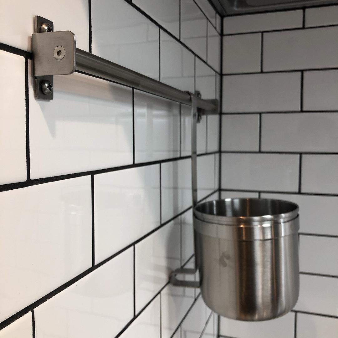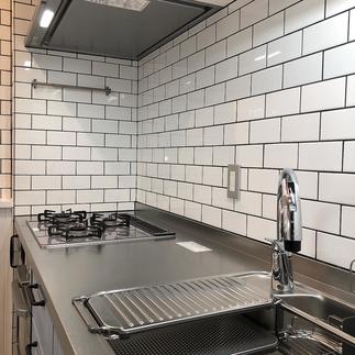 壁タイルは全面貼りをご要望。お客様ごメーカーのサンプルをお取り寄せになり、最終的にTNコーポレーションのサブウェイになりました。黒目地は名古屋モザイク。