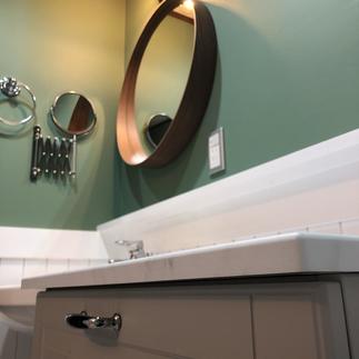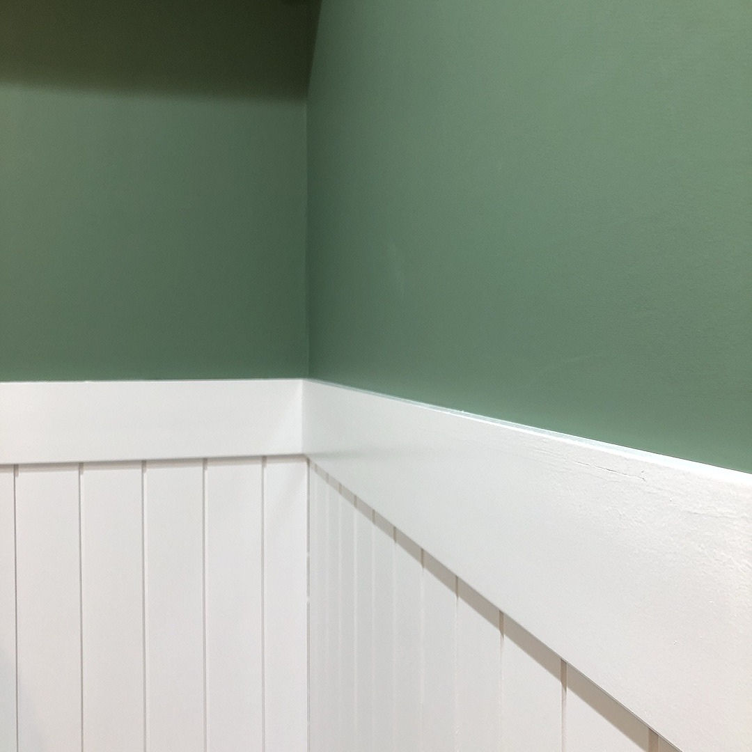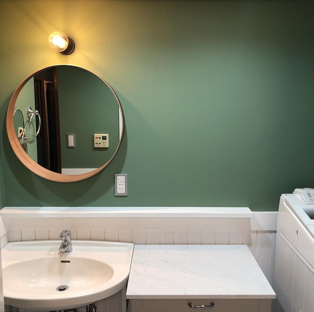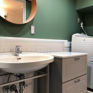 一つ前の事例でご紹介のキッチン同様に、腰壁(ヒノキ・目透かし加工~艶なし塗装)を施工。 洗面化粧台は既存の物です。配管更新で脱着しました。