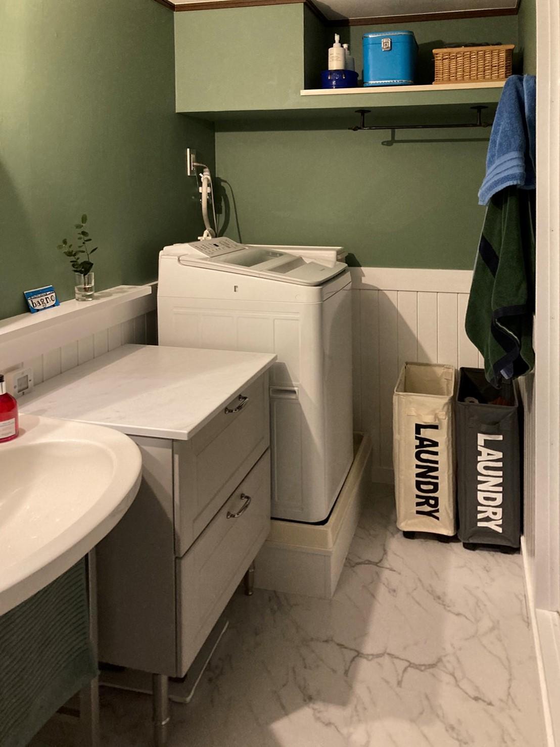 洗濯機の水栓を奥に移設。 給水ホースもインテリア空間の邪魔になりません。腰壁の上部にカウンターも造作したのでちょっとした小物置き場に。