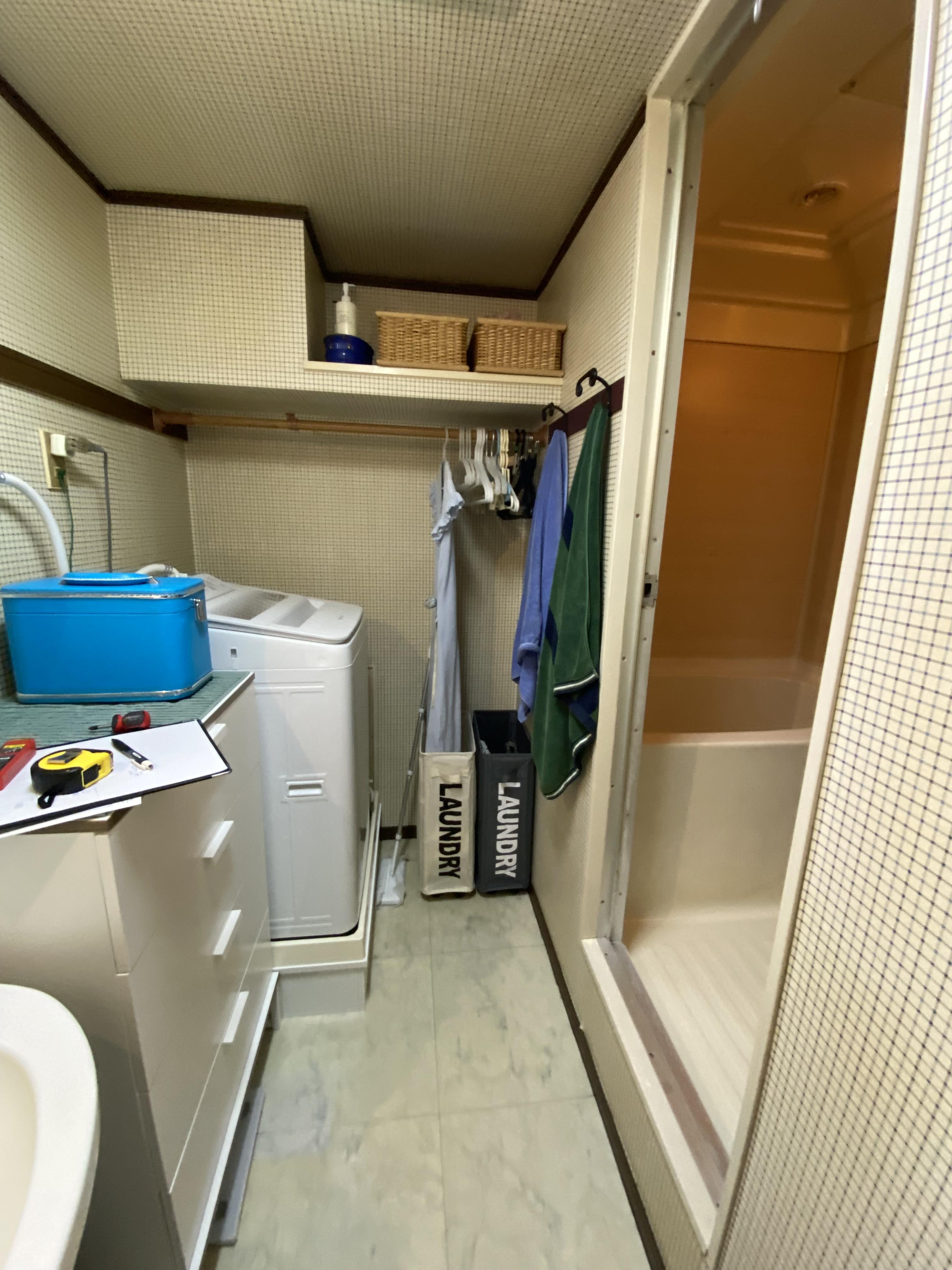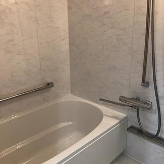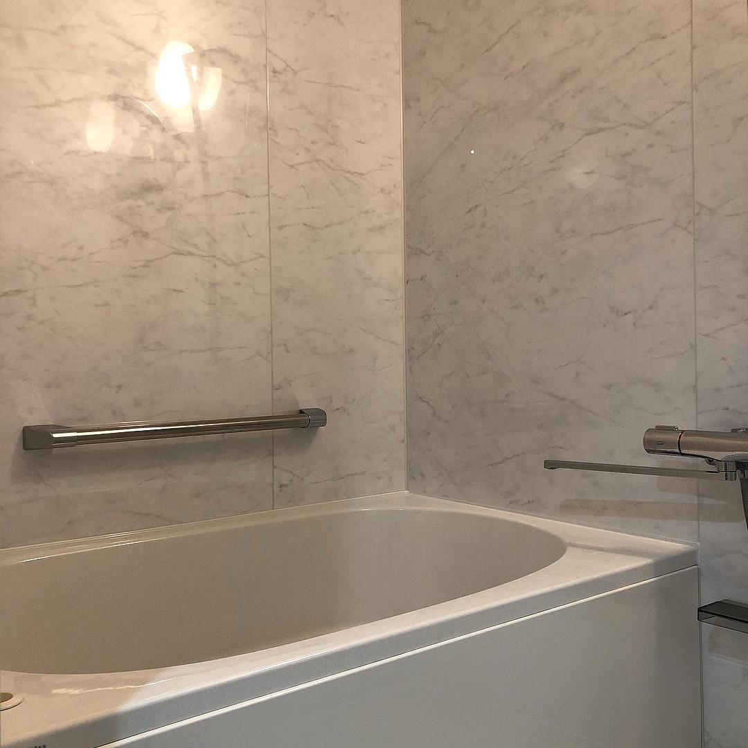 浴室はLIXILリノビオV。シンプルでお掃除しやすいのを望まれ、最終的には鏡も無くしました。 ホワイトストーンのパネルが、洗面所の床と見事にコーディネートされています。