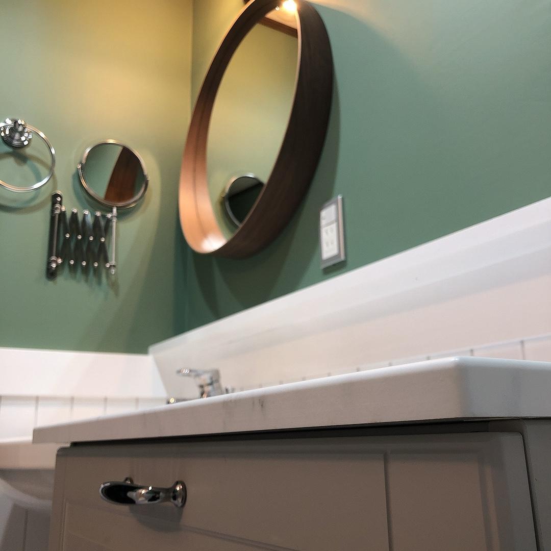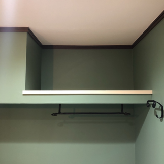 クロスは、モリスヘリテージカラーズの中からタイムを。他のモリスの商品と違って価格を抑えました。ホワイトの腰壁との相性抜群です。お手持ちの鏡2種類とタオルハンガーは、ご指定の場所に戻しました。