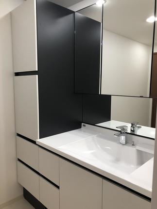 洗面台はこちらもLIXIL人気のルミシス。ボウル一体成形でお手入れもスムーズ。新てまなし排水口は、なめらかな形状で、キャッチャー下の奥の突起がなくお掃除簡単です。