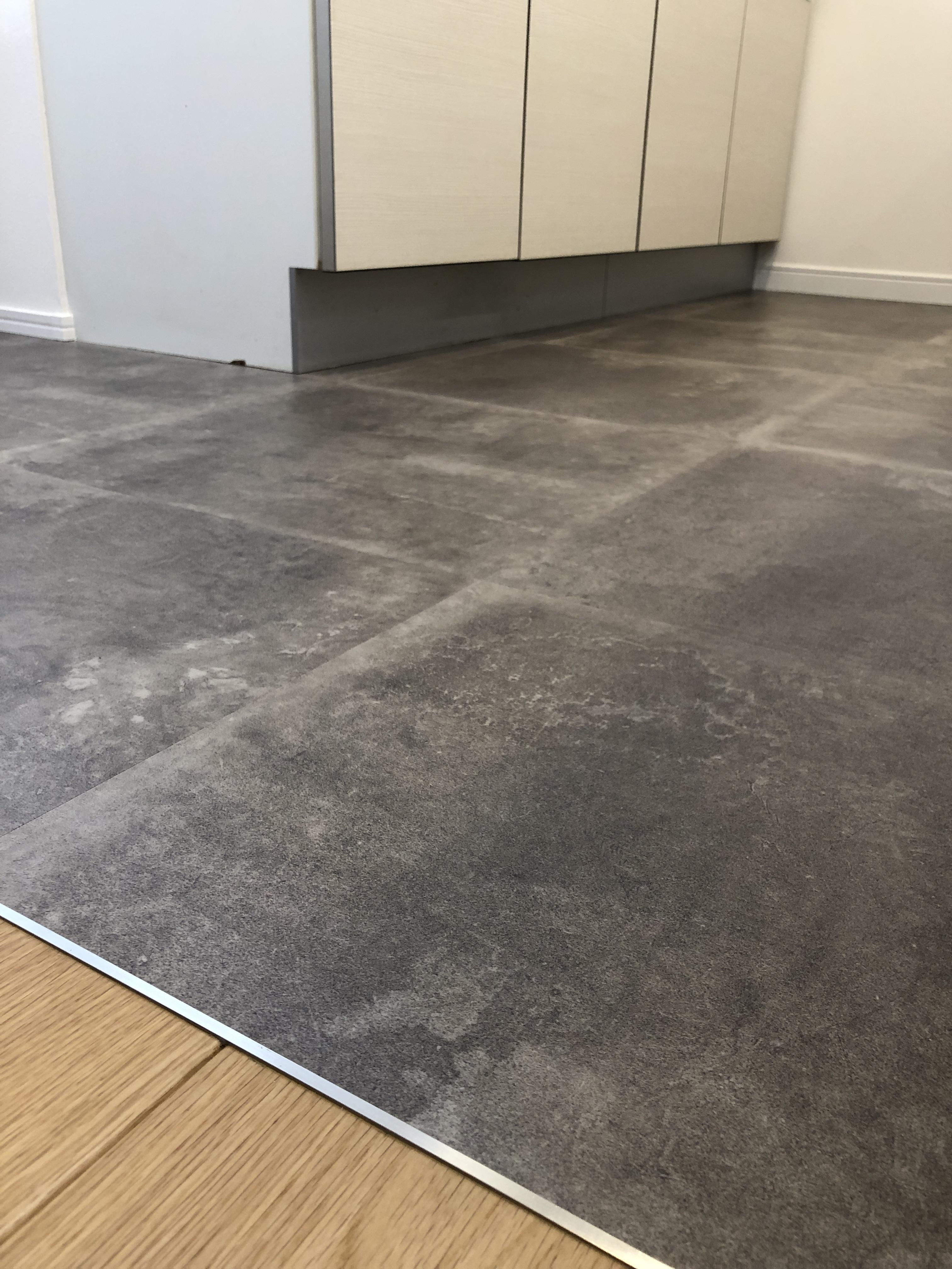 LDへ続くドアは、LIXILラシッサのガラス付き扉。透け感があり、より明るく室内を引き立てています。LDに隣接していた洋室は、間仕切り壁を撤去し広々LDKに。高さ調整を施したキッチン床の、グレーカラーと質感も素敵です。