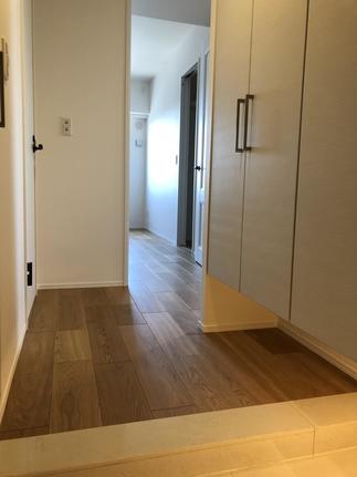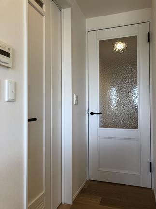 全体的に茶系のダーク系でした扉とフローリングをリフォーム。室内扉を4箇所、LIXIL扉に取替えホワイトで統一しました。