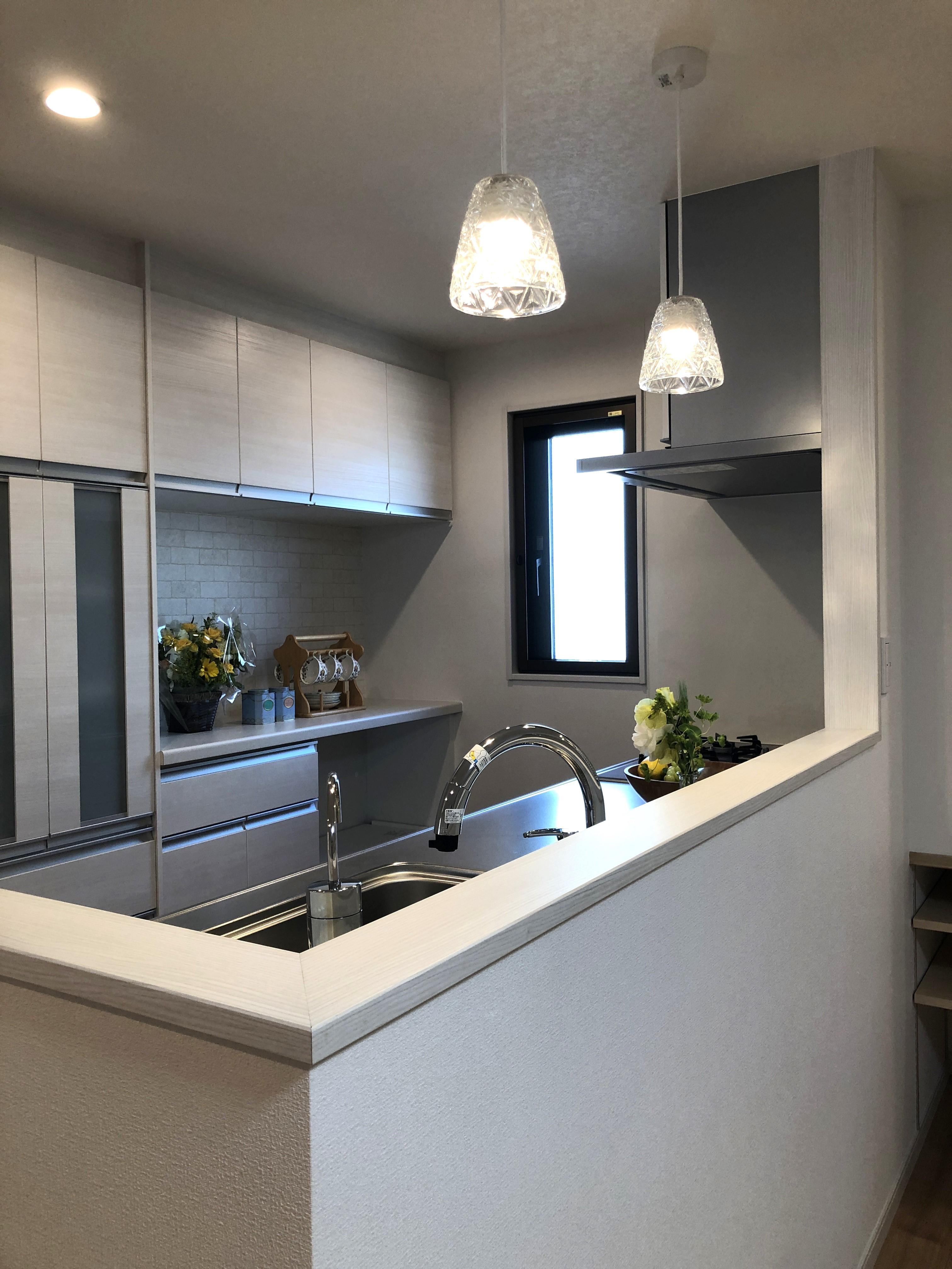 LIXILのシステムキッチンはアレスタのペニンシュラI型。インテリアにすっきりなじむデザインと、クリエアイボリーのやさしいカラーで居心地のよいLDKに。