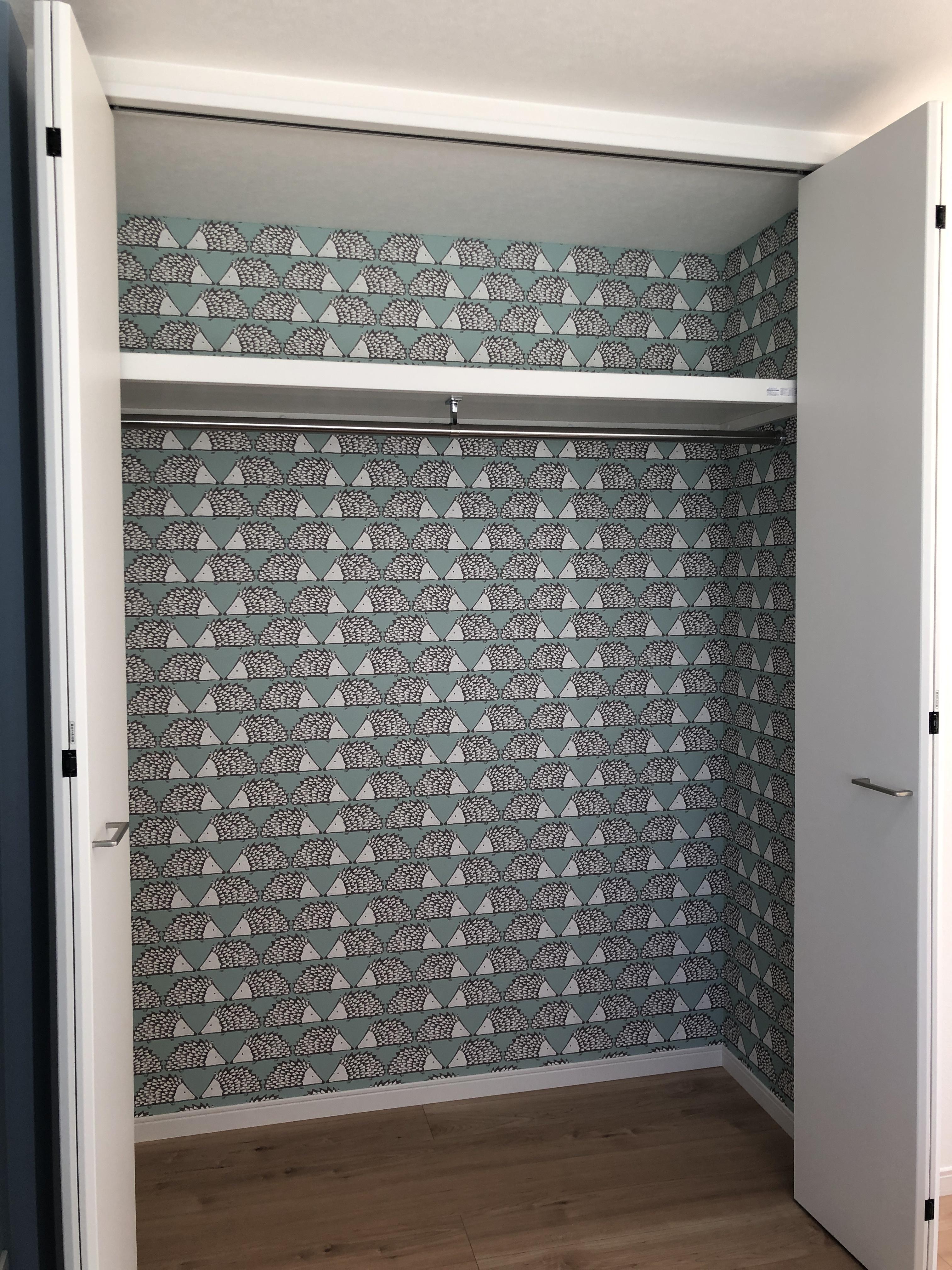 お子様部屋のクローゼットにはハリネズミ絵柄のクロス(FE74370)をチョイス。部屋内のブルーペイントのラシッサSドアとのコラボで、落ちつきとかわいらしさとを両立されました。