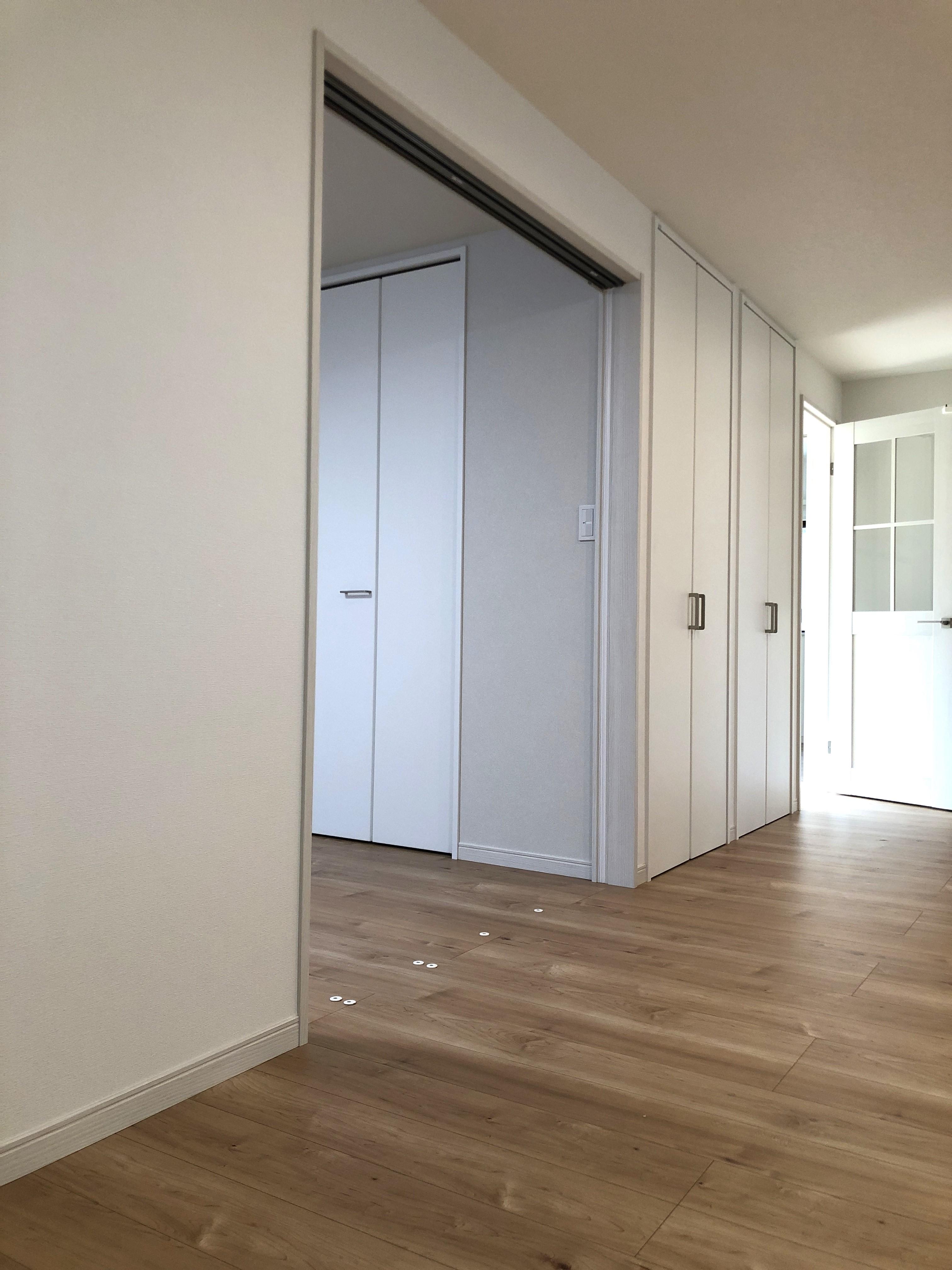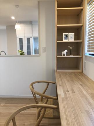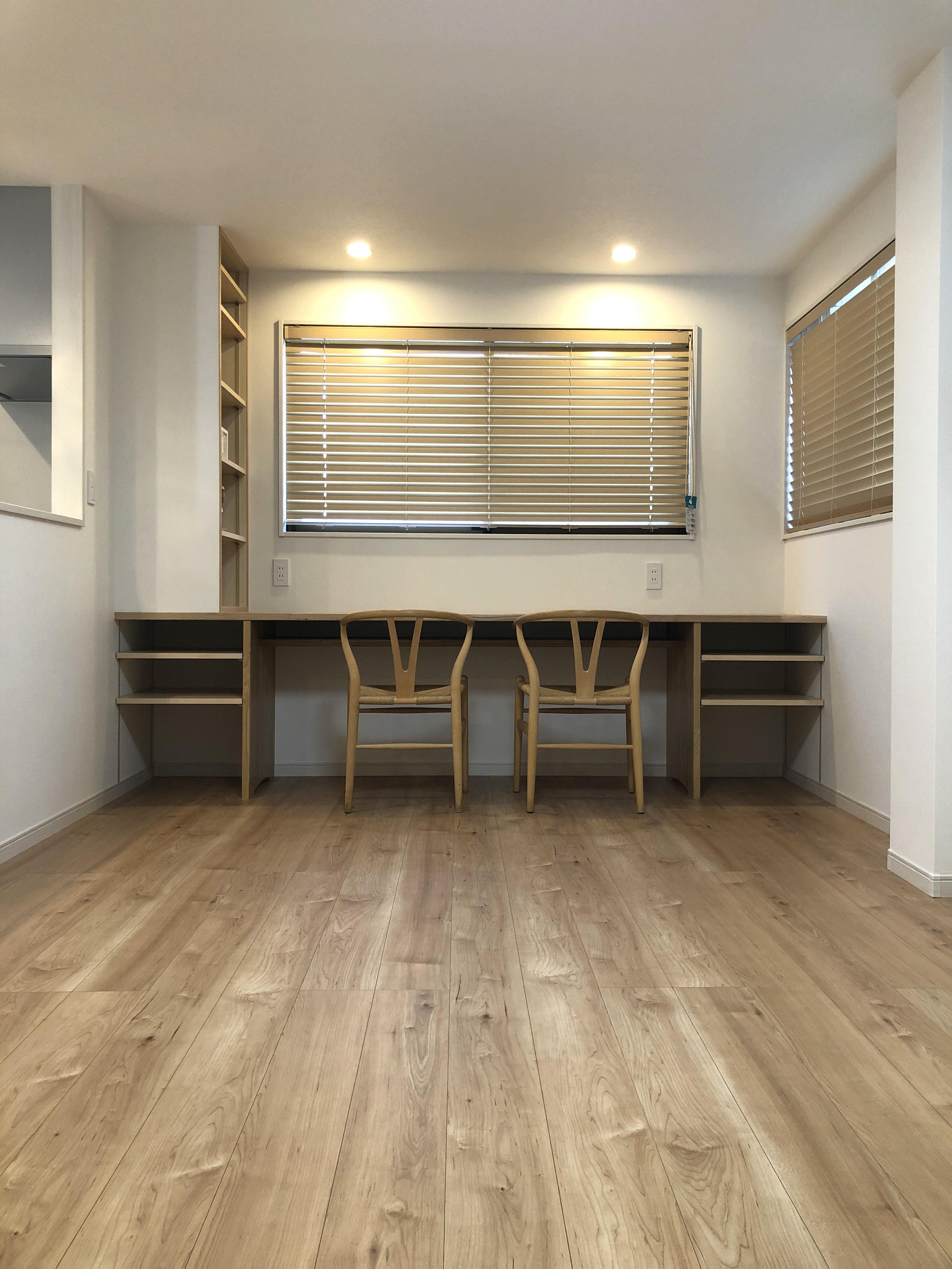 お子様の勉強やワークスペースにもなる窓際デスクを設け、洋室へと続く間仕切りドアを開ければ、さらに広々と開放感あるLDKとしてお過ごしいただけます。