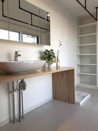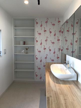 ランドリールームには、ハンギングバーを設置し、大容量の収納棚と洗面カウンターは造作。フラミンゴのクロス(sangetsu ファイン:FE74417)をアクセントに、おしゃれ爽やかな多機能空間を実現しました。