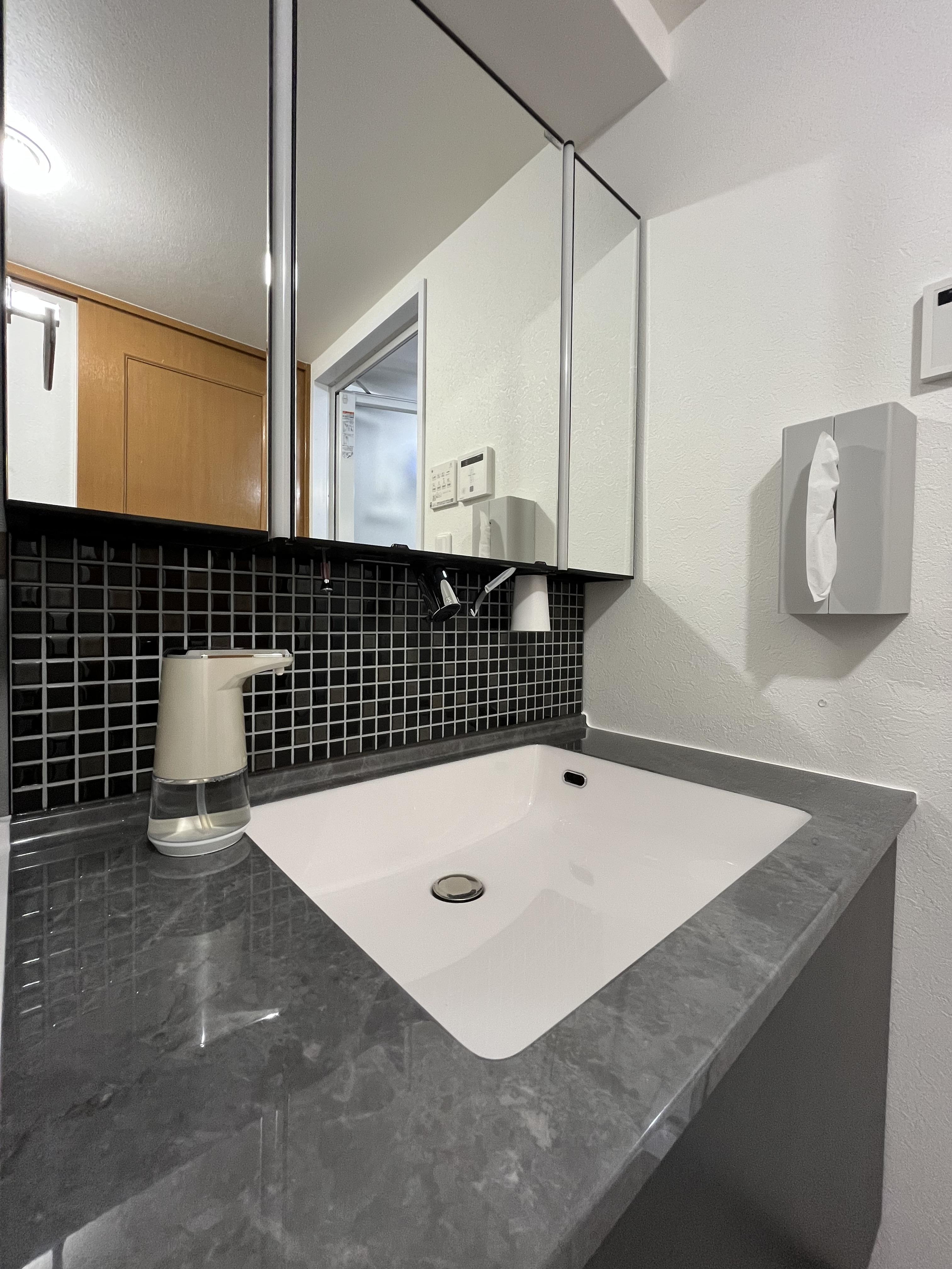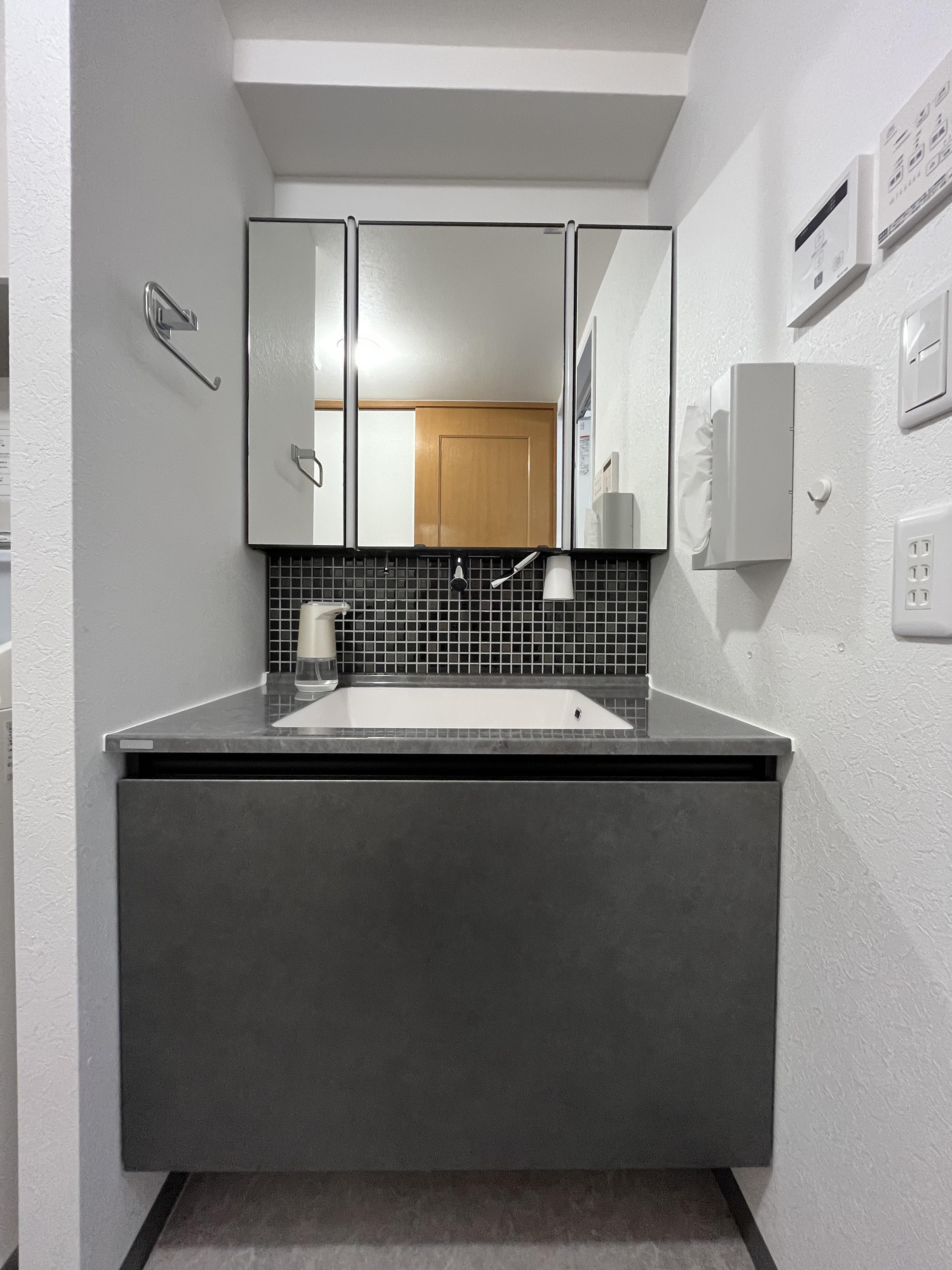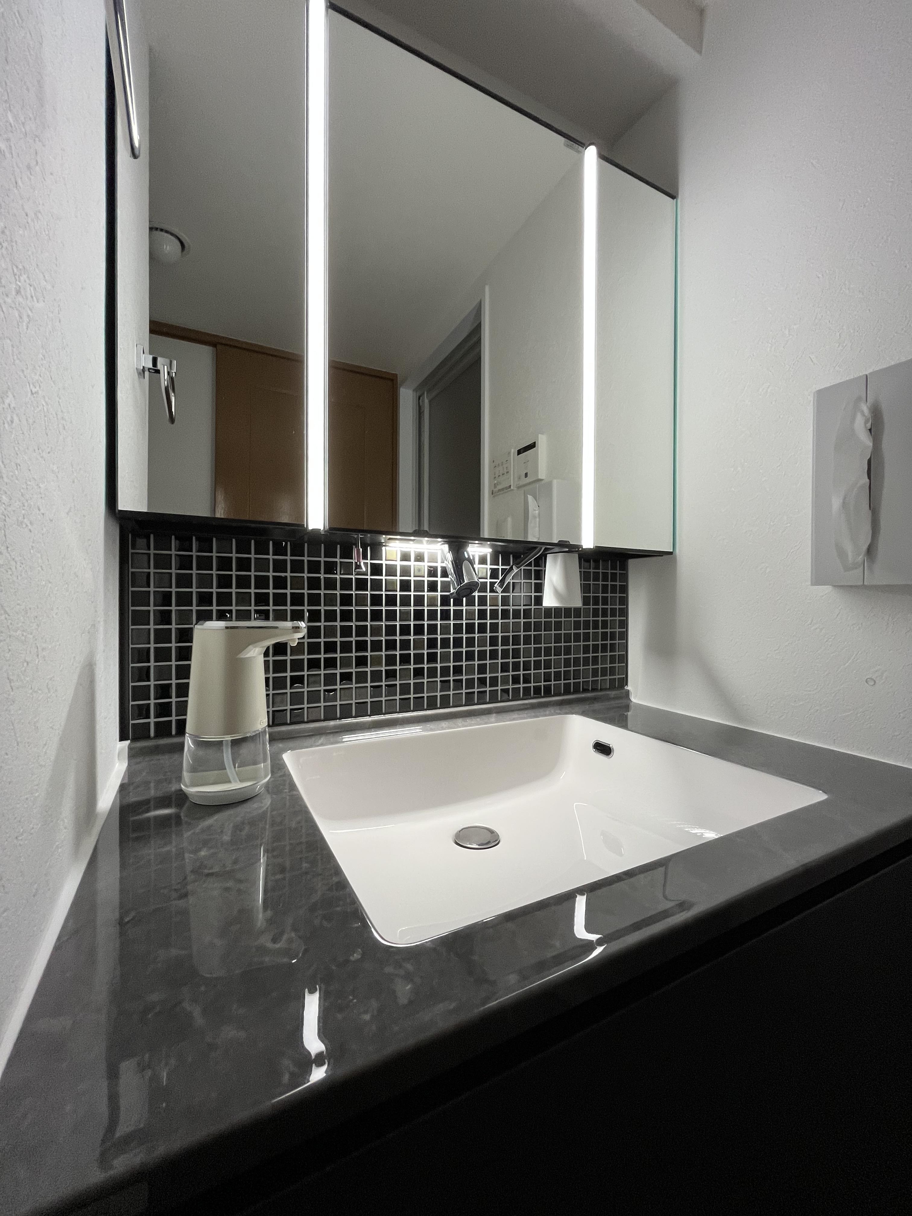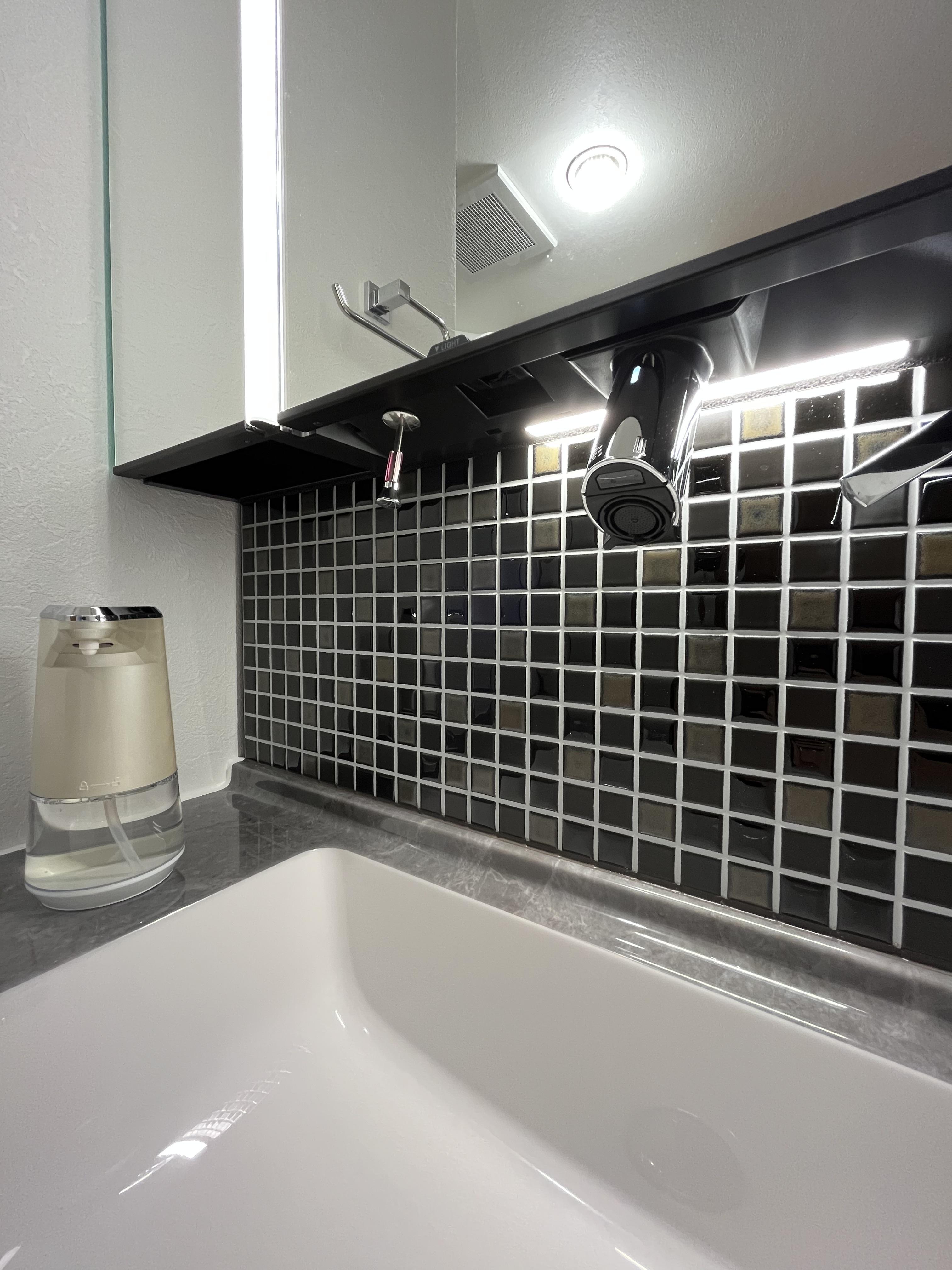 洗面化粧台『ルミシス』 の決め手はバックパネルの黒色モザイクタイル。
