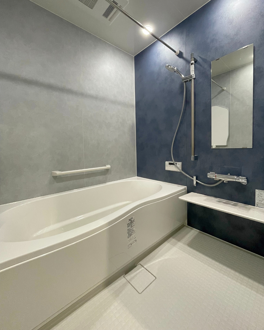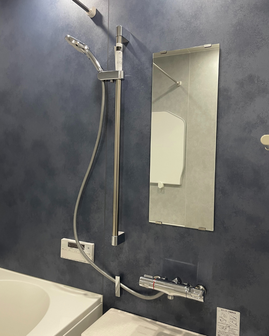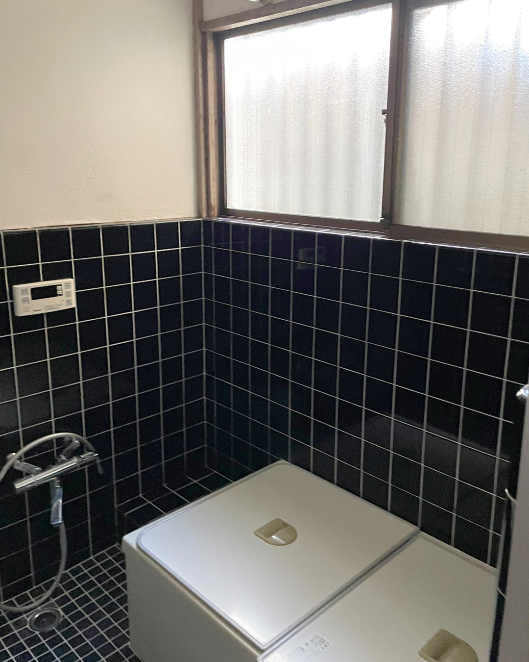 浴室ブラックタイル貼りと浴槽ホワイトのコントラストがお洒落で目地もきれいなビフォアー。