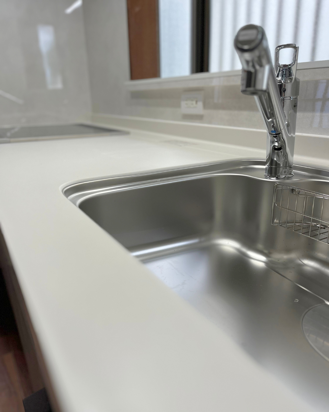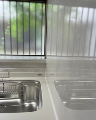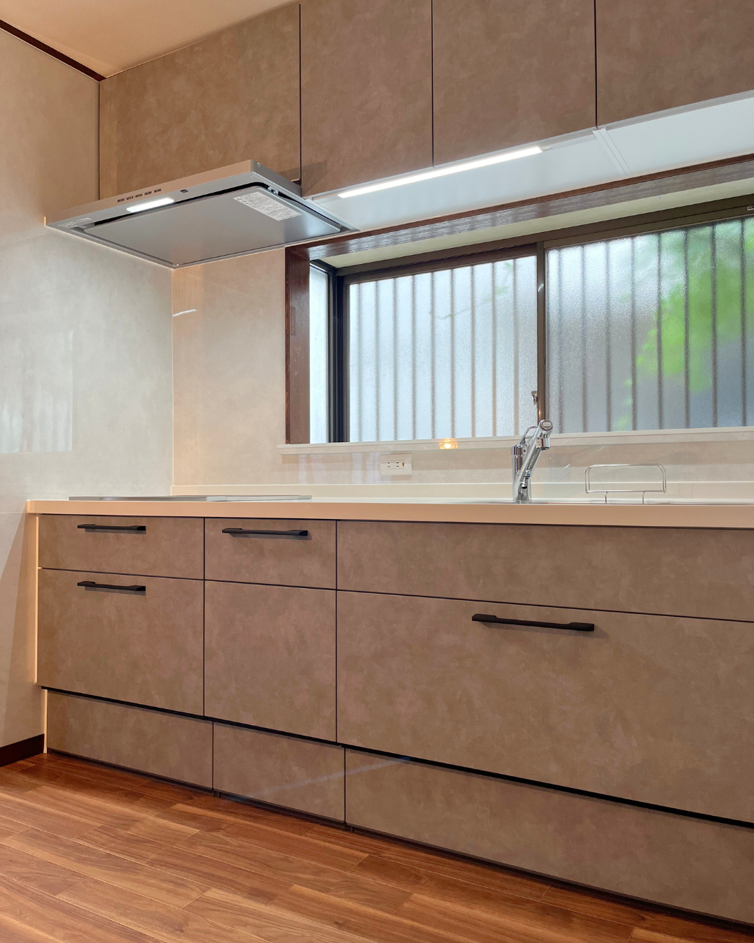 出窓下面のビフォアーはステンレスでした。奥行きサイズは従来のまま、新装のキッチンパネルが引き立ち格段に広々と感じられます。