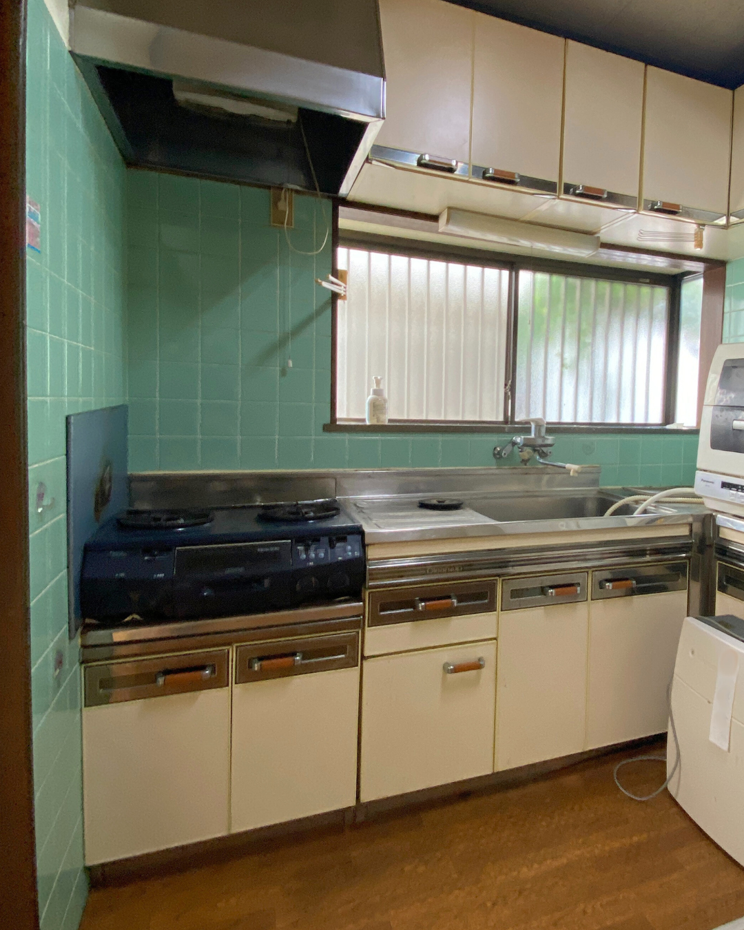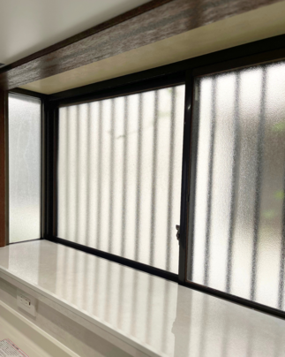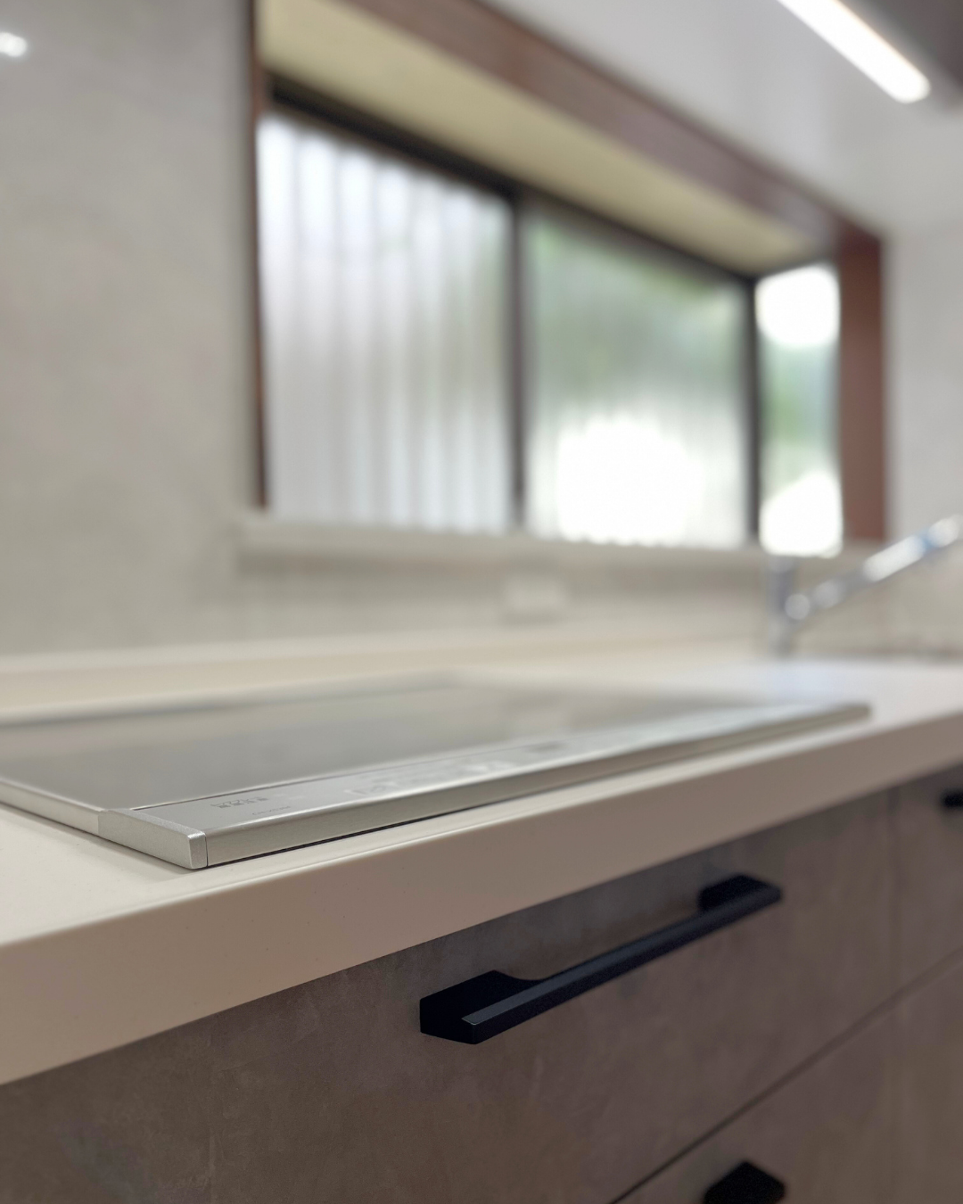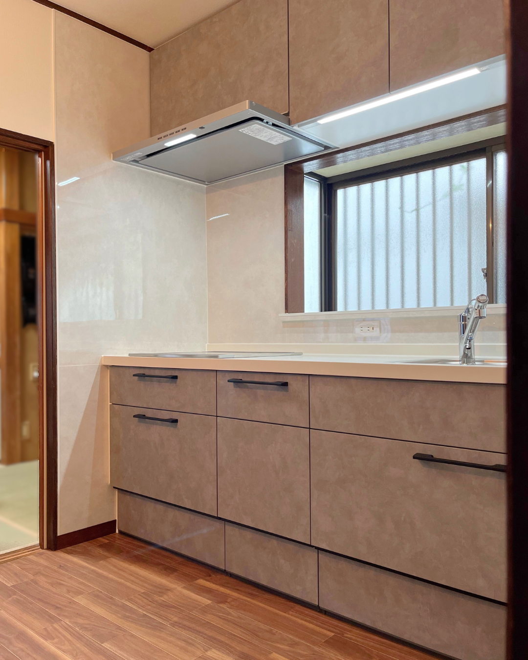 出窓下面のビフォアーはステンレスでした。奥行きサイズは従来のまま、新装のキッチンパネルが引き立ち格段に広々と感じられます。