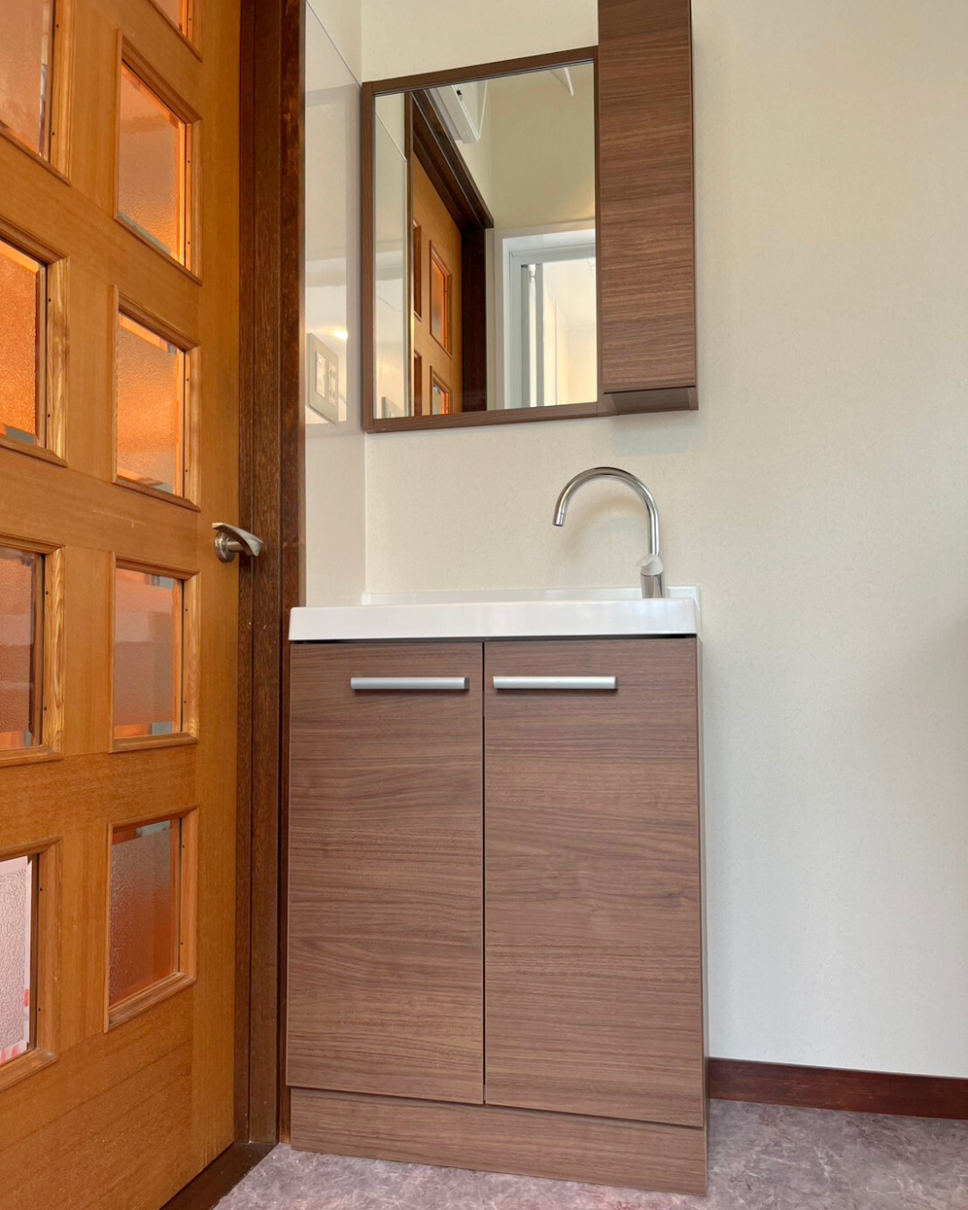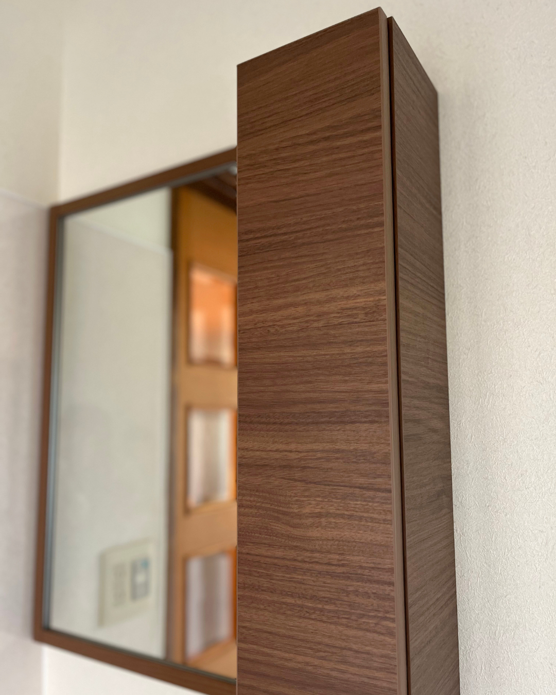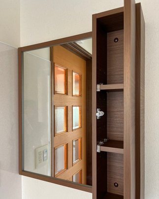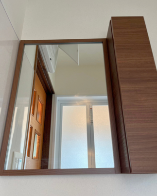 インテリアになじむ木枠の1面鏡の佇まいがお住まいにジャストフィットされました。