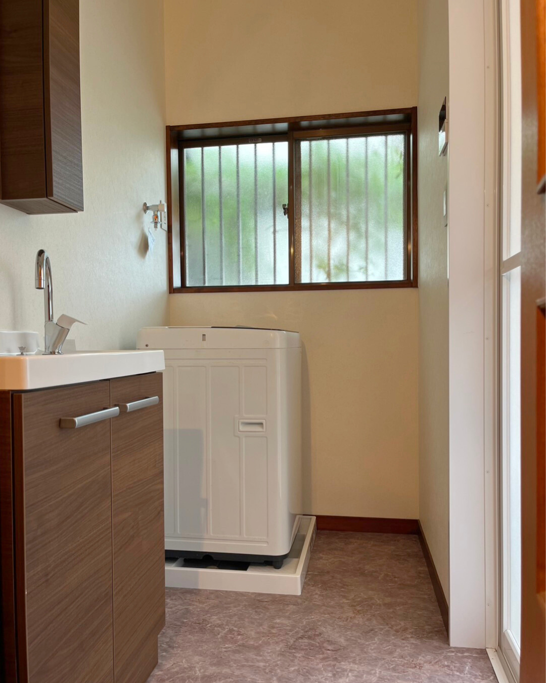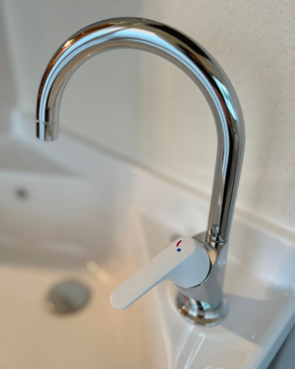 奥行きがコンパクトながら深形洗面器を実現しているLIXILのリフラ。バケツもすっぽり入って水汲みなど多目的に使用できます。