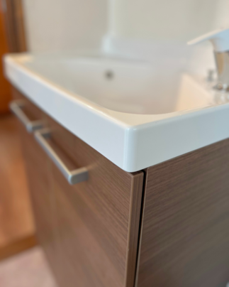 一般的な奥行き570mmの洗面台サイズから、約70%のサイズダウン。ゆとりの脱衣スペースを実現しつつ、洗面器下は収納空間としてご活用。