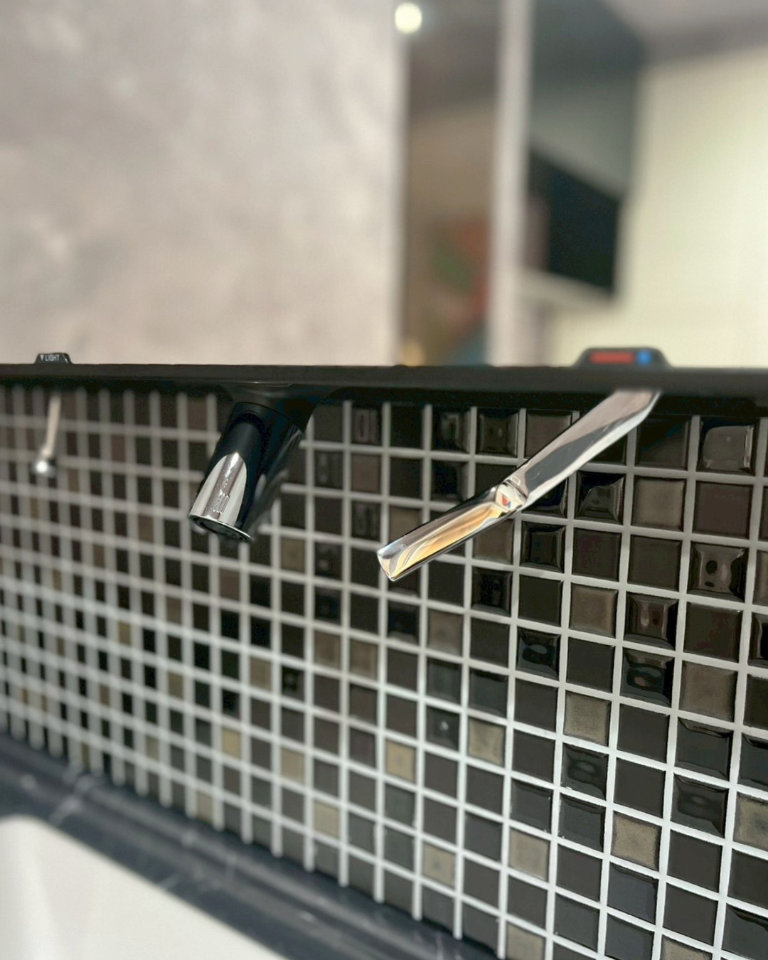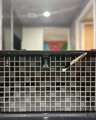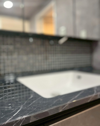 上部からの吐水、水撥ね少なく汚れにくいのはもちろんのこと、水栓とミラーの一体感あるデザインが効いてすっきり美空間となりました。