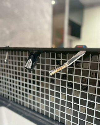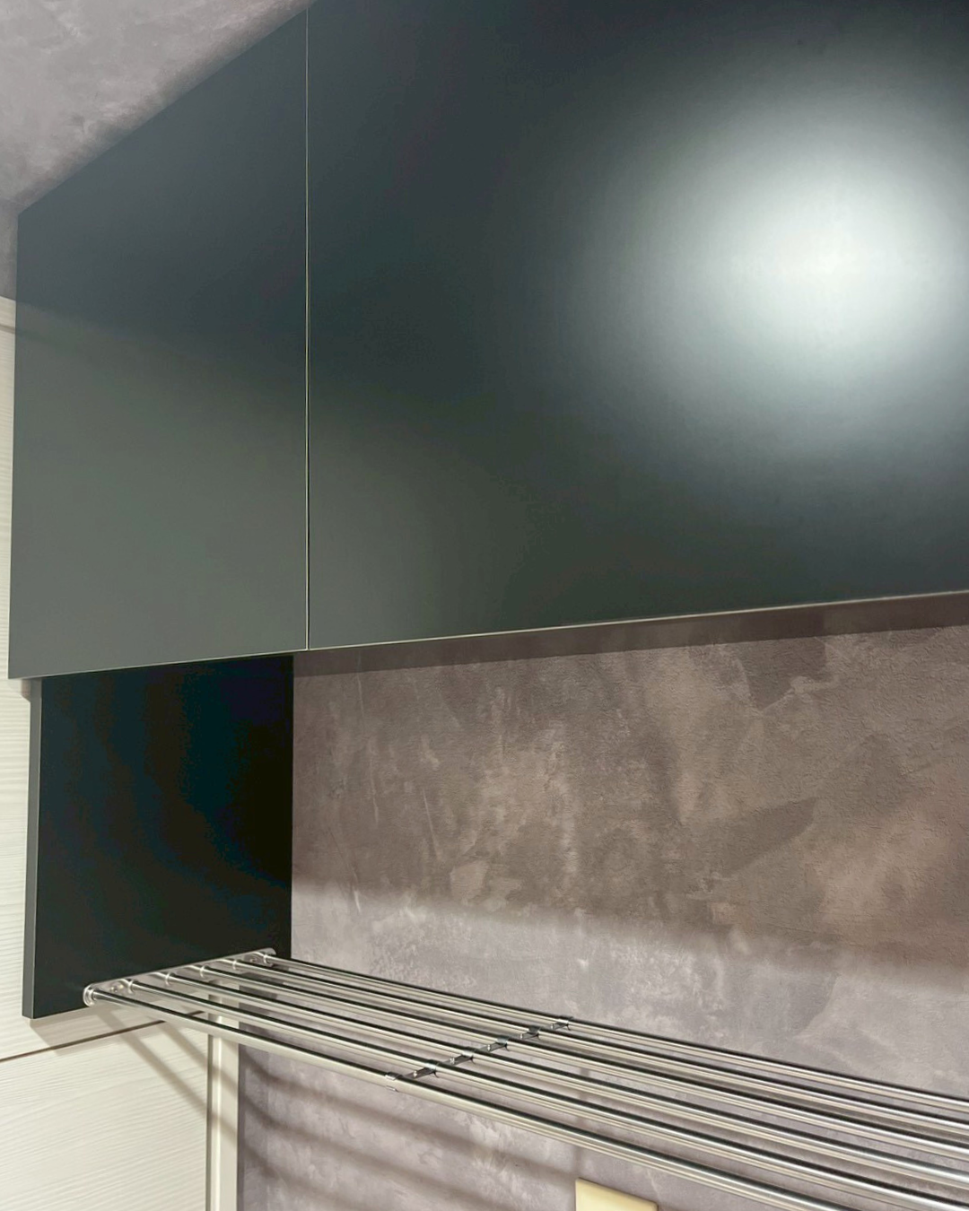 ビフォアーは白い吊棚でした。横通しパイプ部のみ残して、シックなトーンに合わせての新装です。