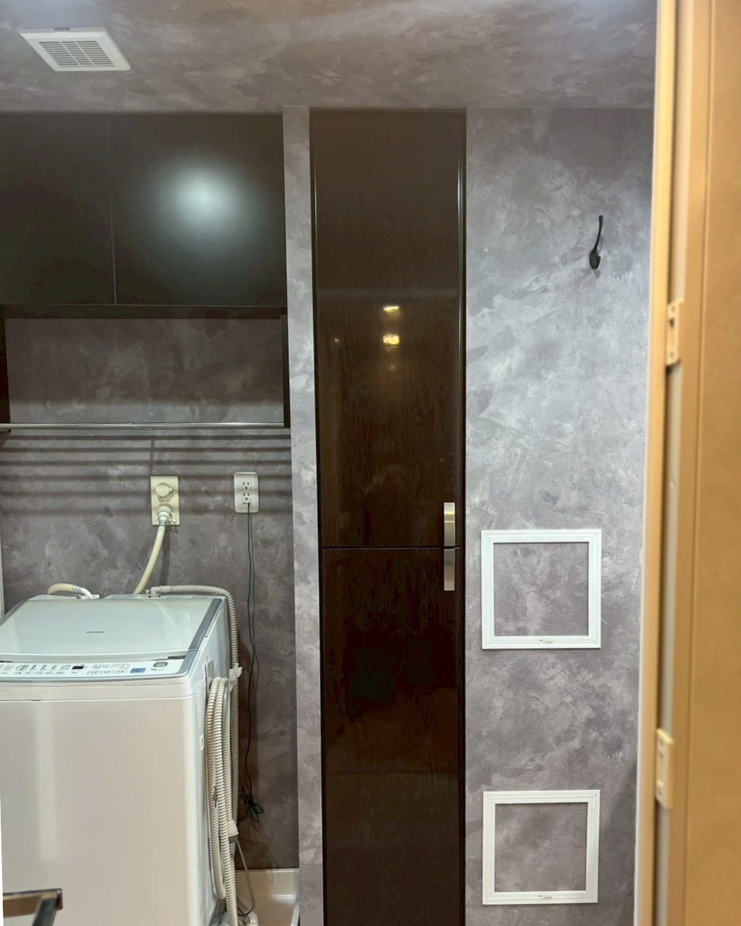 洗濯機上部の黒い吊棚は造作しました。