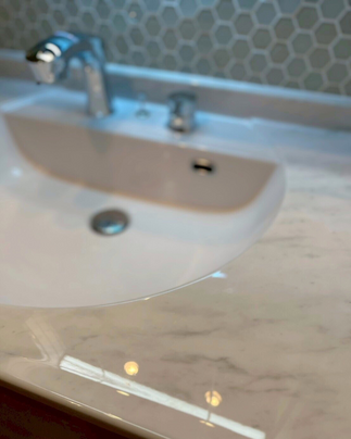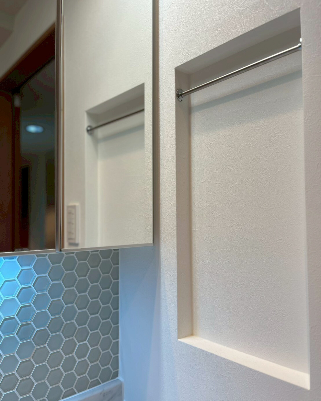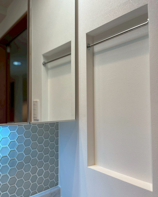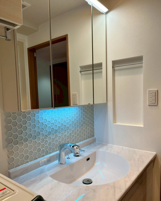 化粧台カウンター上のタイル:ヘキサガラス DTL-R/HXA-1