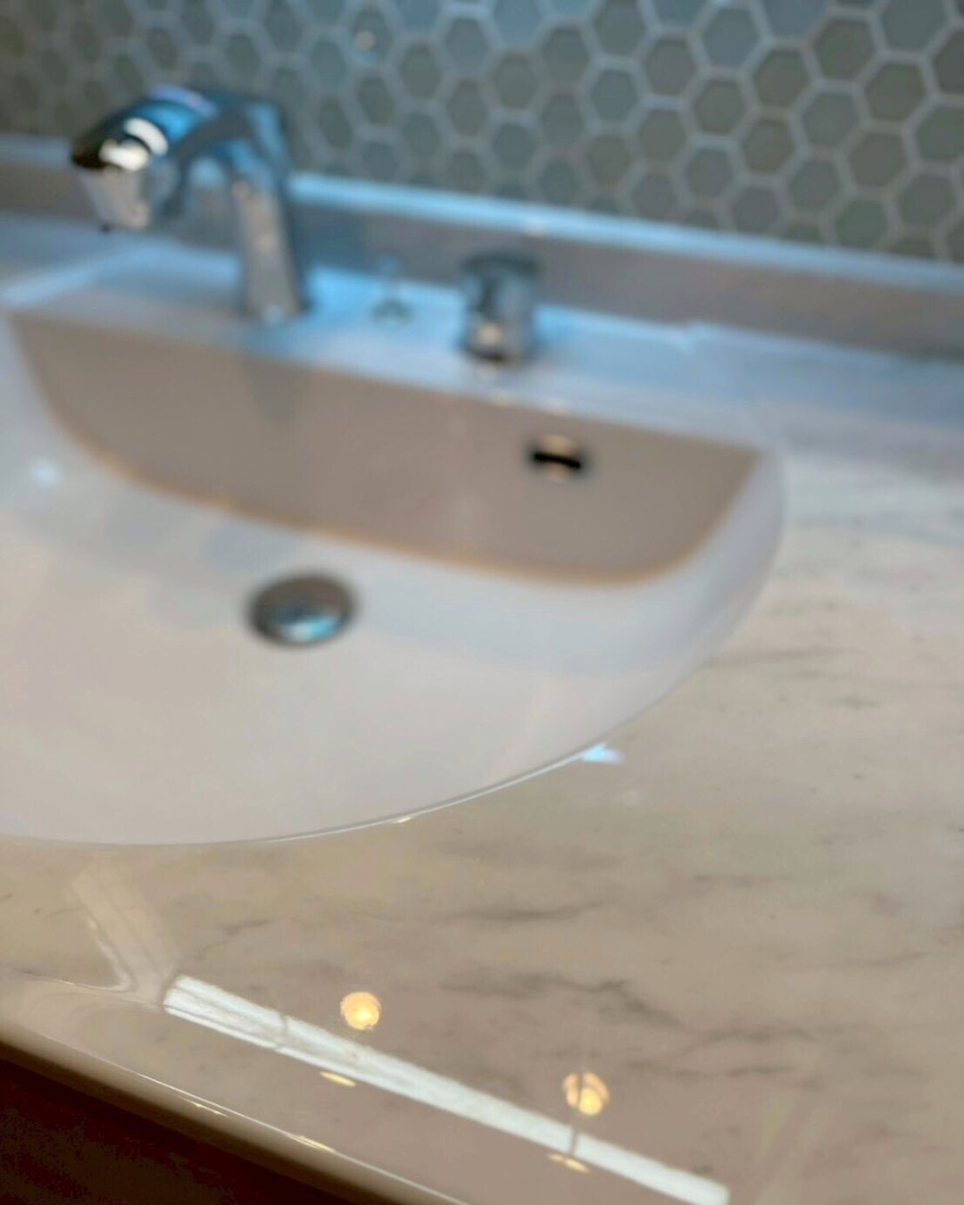 ミラー下のタイル張りバックスプラッシュが、ルミシス洗面台の上部ライン照明に美しく照らされ、ヘキサガラス(六角形平ネット張り)の魅力を引き立てています。