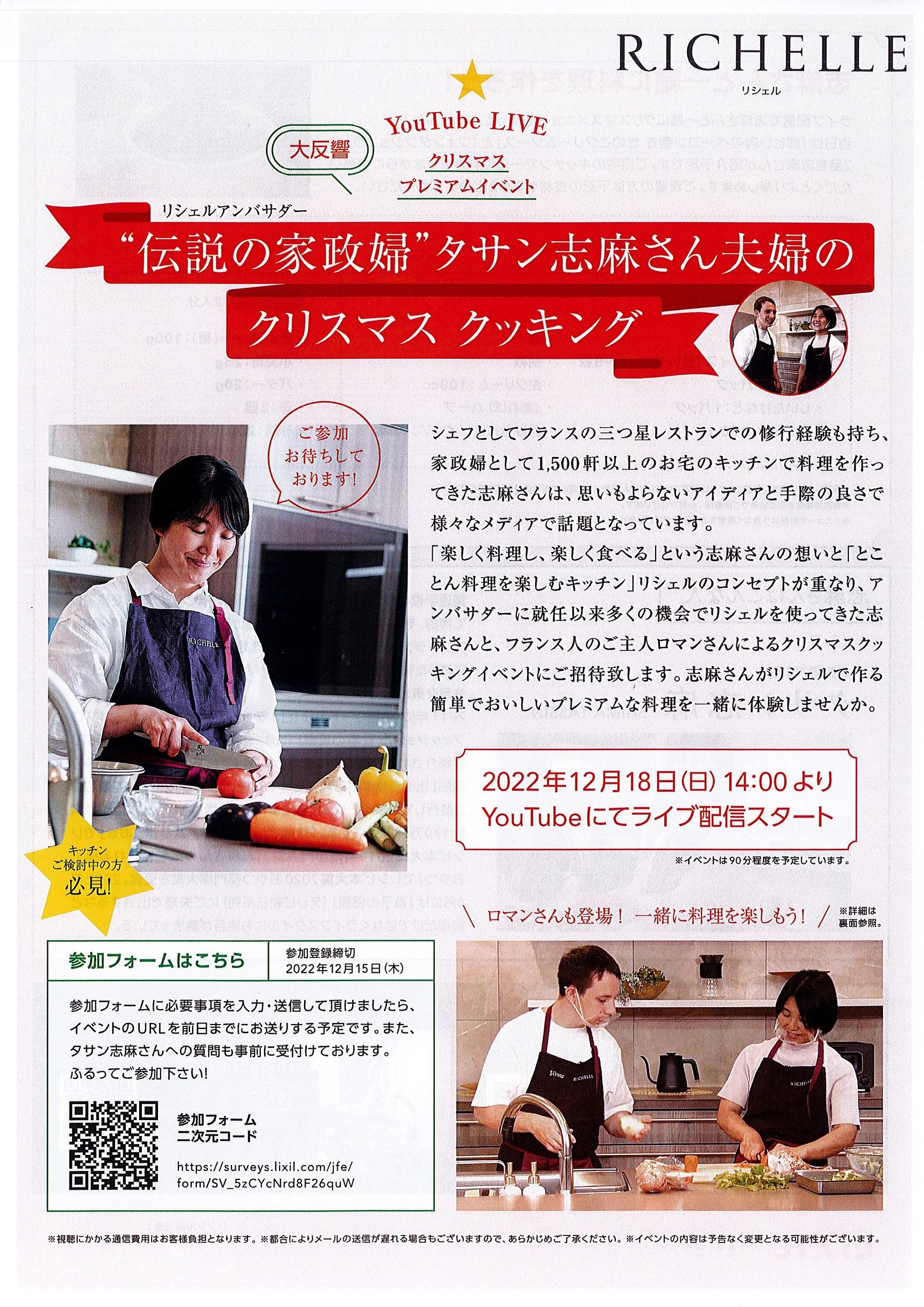 こんにちは。秋の深まりを感じる今日この頃、皆様にステキなイベントのお知らせです。LIXILリシェルアンバサダーを務める″伝説の家政婦″ことタサン志麻さんと、フランス人のご主人ロマンさんによるクリスマスクッキングイベントにご招待致します。志麻さんが作る簡単でおいしいクリスマスの料理を体験しませんか。2022年12月18日(日)14時よりYou Tubeにてライブ配信スタートです!皆様のご参加をお待ちしております。