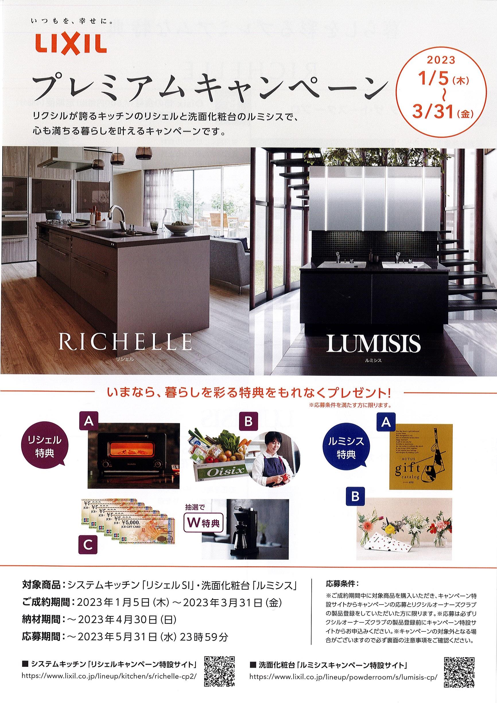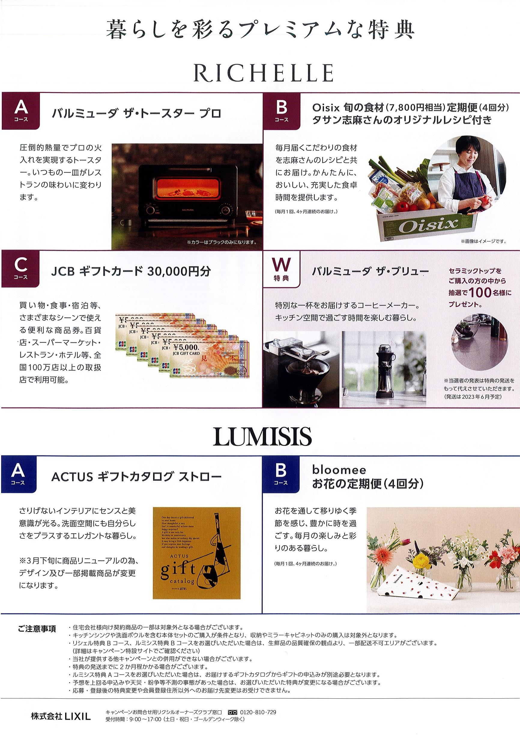 リクシルが誇るキッチン・リシェルと洗面化粧台・ルミシスをご購入の方に特典のプレゼントがございます!