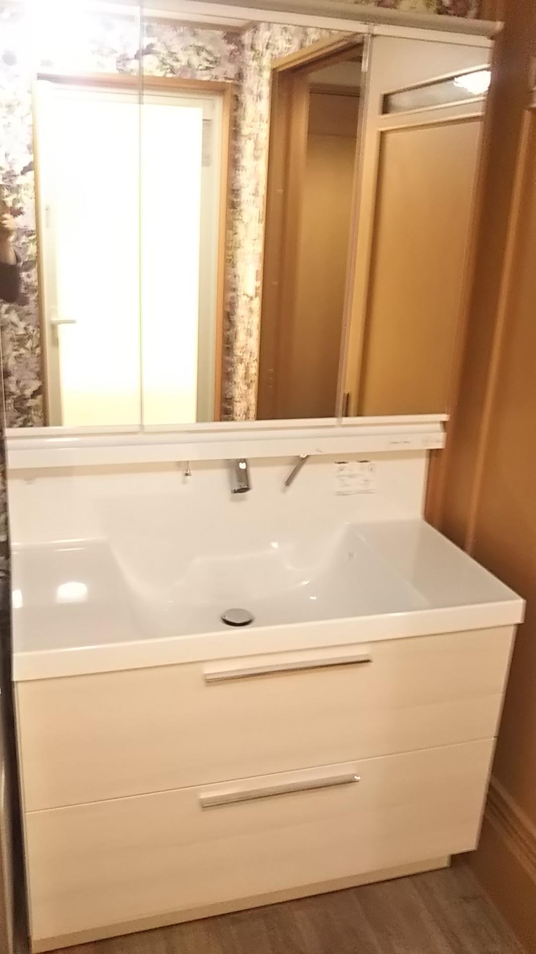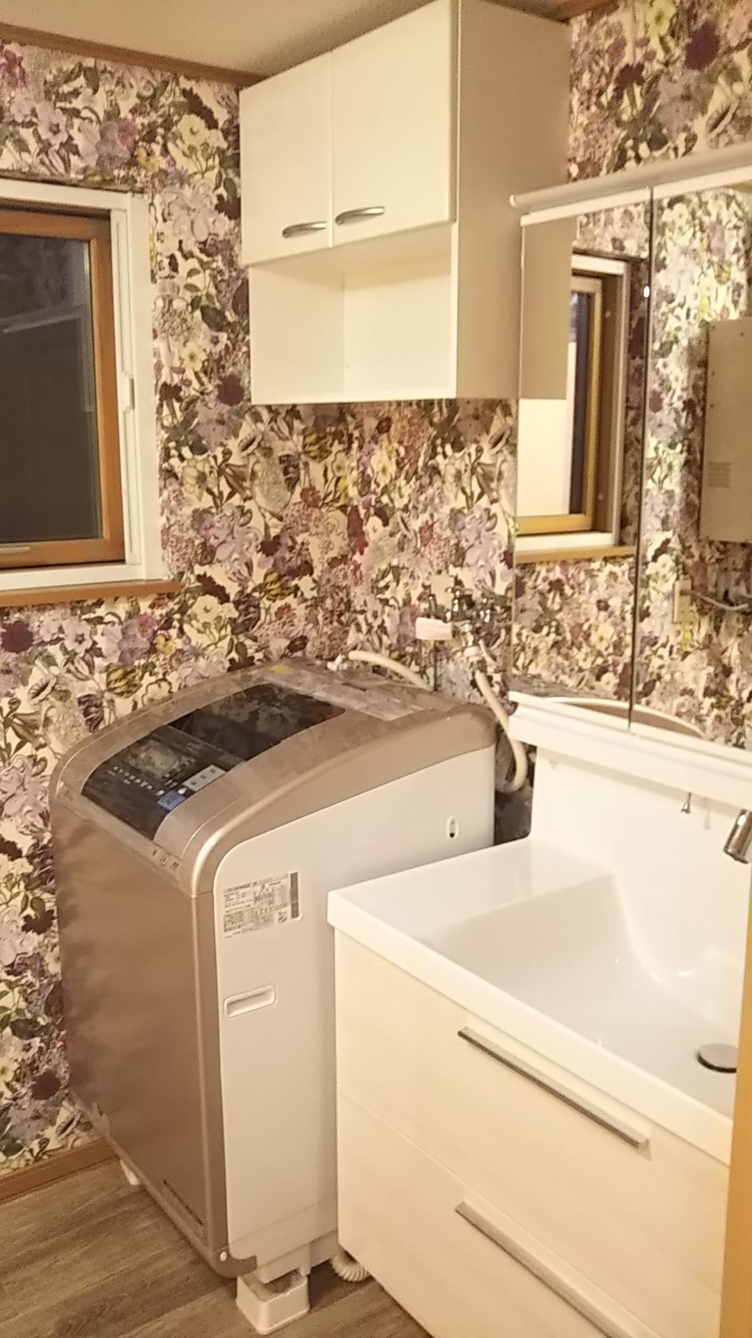 洗面化粧台を入替る事になり、その際に床や壁紙も貼り替える事になりました。工事も1日で終わり安心しました。 S様いつも当社をご利用いただきありがとうございます。今後とも精進します。