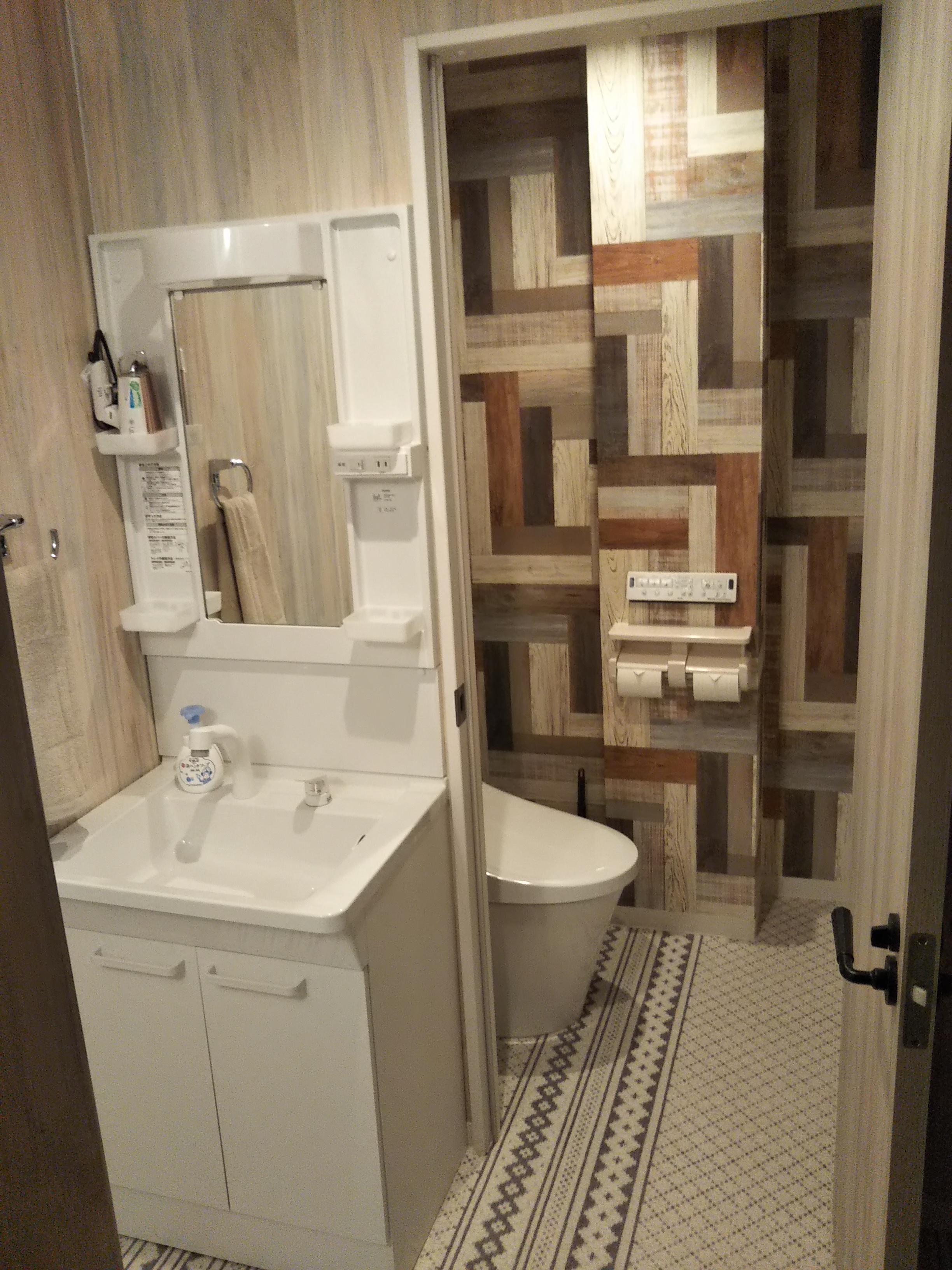 1階の事務所の向かいのお部屋にあった納戸へトイレ・化粧台・シャワールームを設置致しました。各機器類の設置には配置的に難しい所もありましたが、綺麗に収まりました!