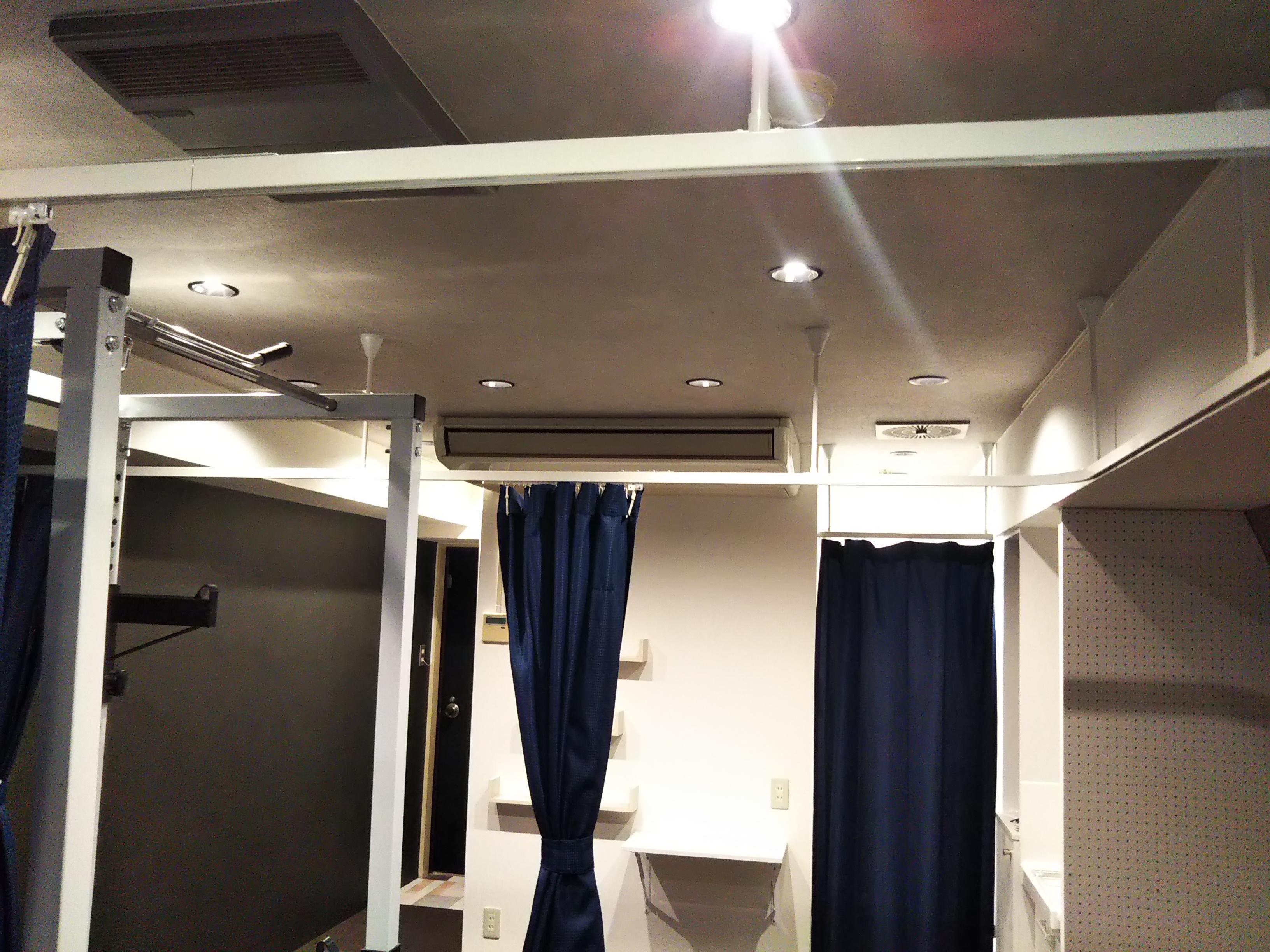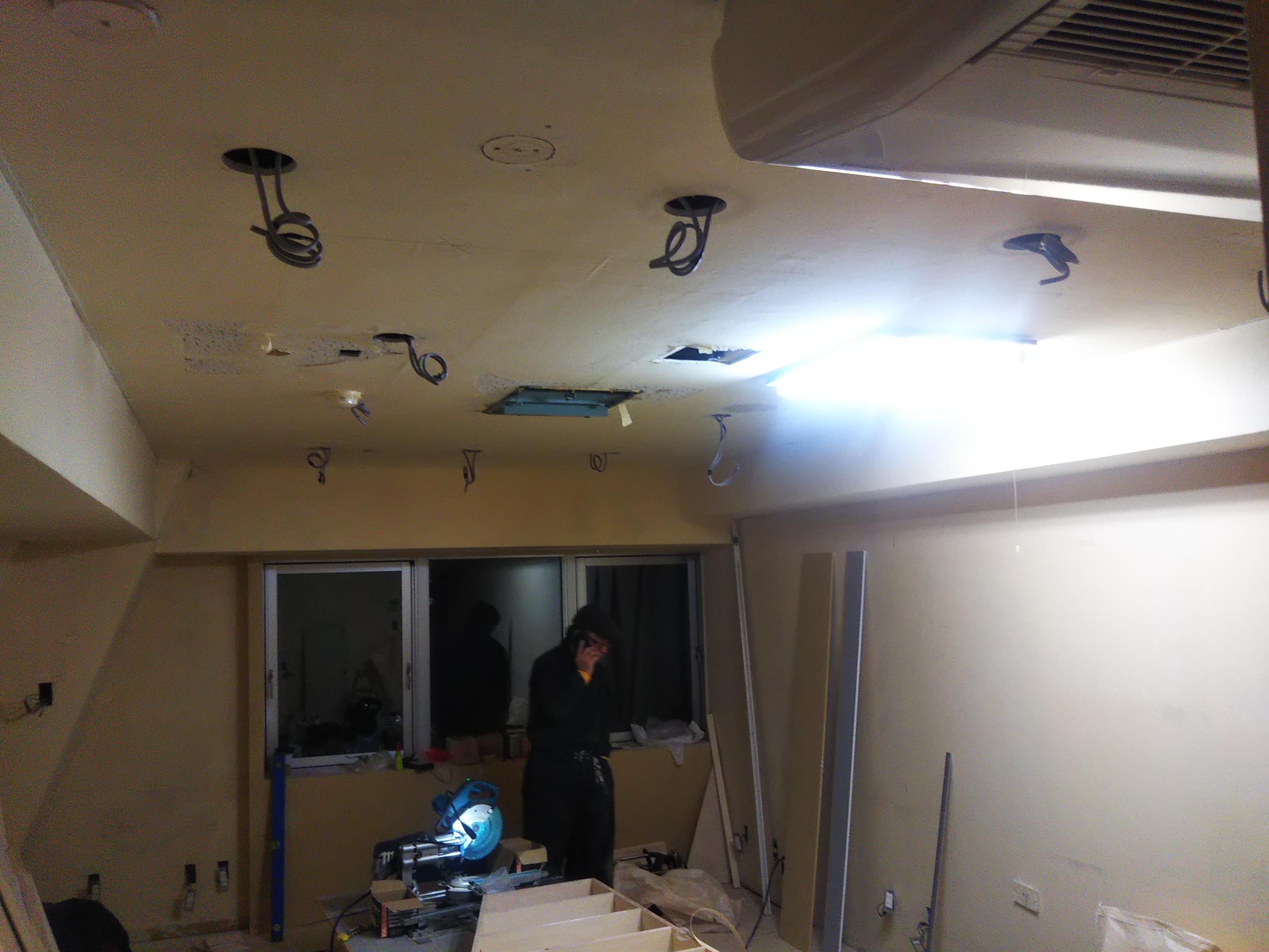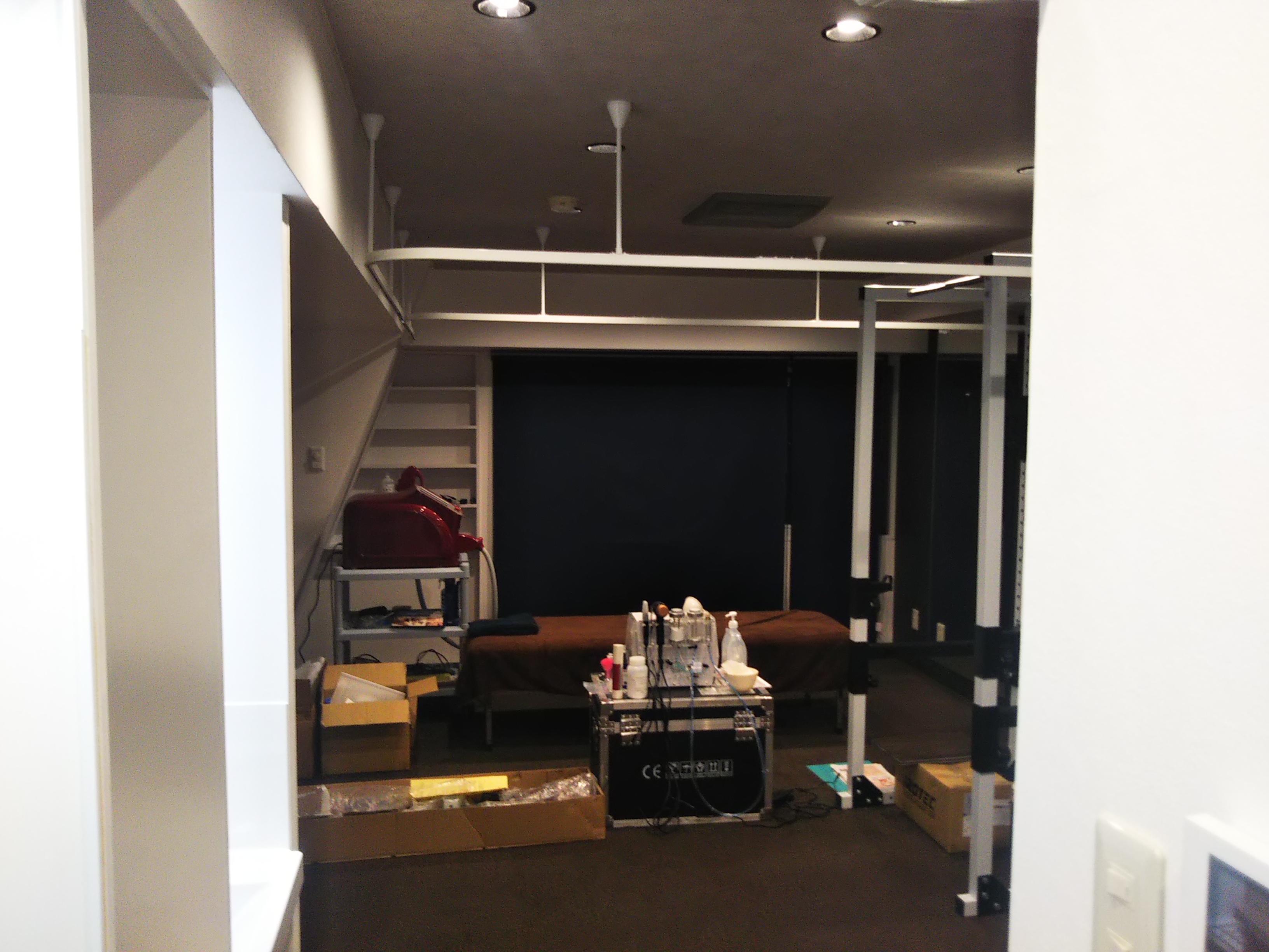 明るさをある程度確保しつつ、お客様のイメージのマッドな感じを崩さないよう、床材に使用したのは、こい茶色の防音材のついたタイルカーペットを使用しました。照明器具は、明るさを確保するために昼白色のLEDダウンライトを12台設置致しました。
