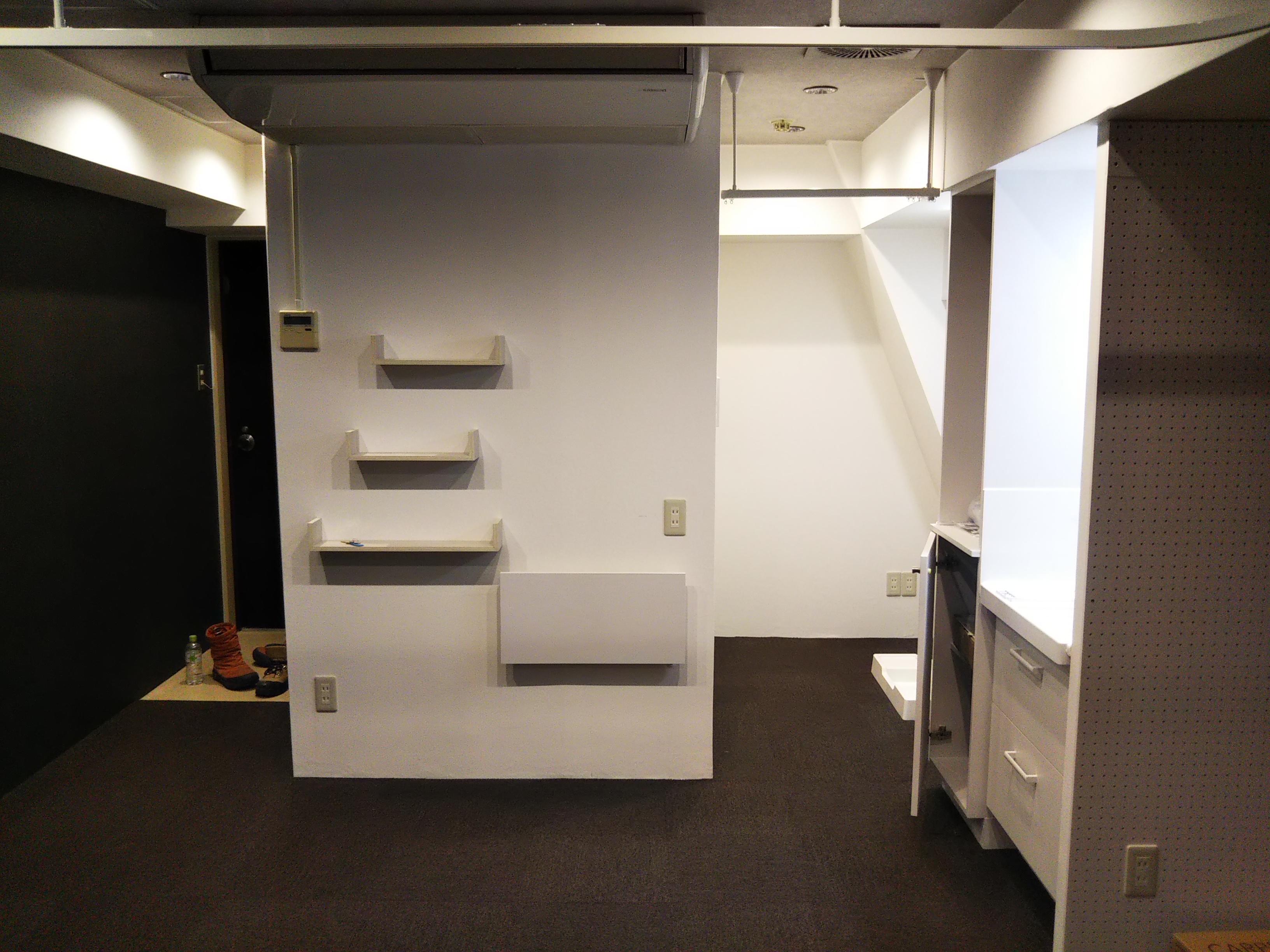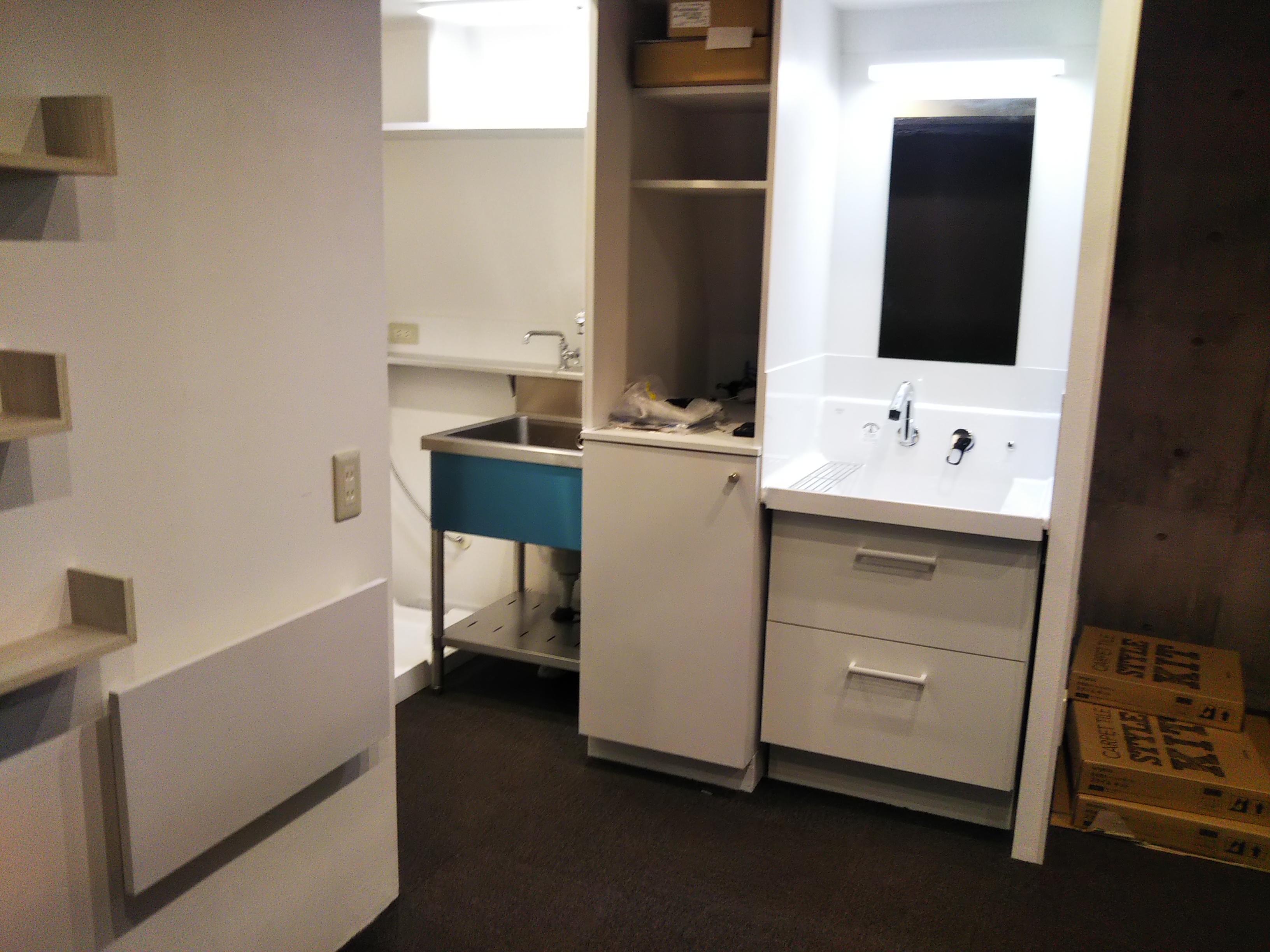 水回りは、店舗の関係上あまり使用しないとのことでしたので、小さなものですっきりとさせ、その周りに収納スペース用の棚を造作して、収納スペースを確保致しました!収納棚はすべて大工さんによる手作りです!